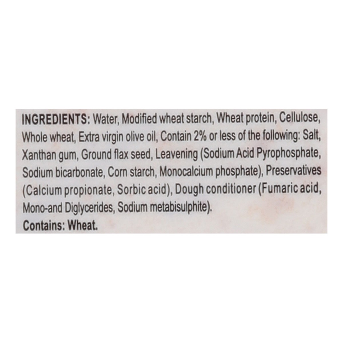 Water, Resistant Wheat Starch, Resistant Potato Starch, Wheat Protein, Cellulose, Whole Wheat, Extra Virgin Olive Oil, Allulose, Contain 2% or Less of the Following: Salt, Leavening (Sodium Bicarbonat…