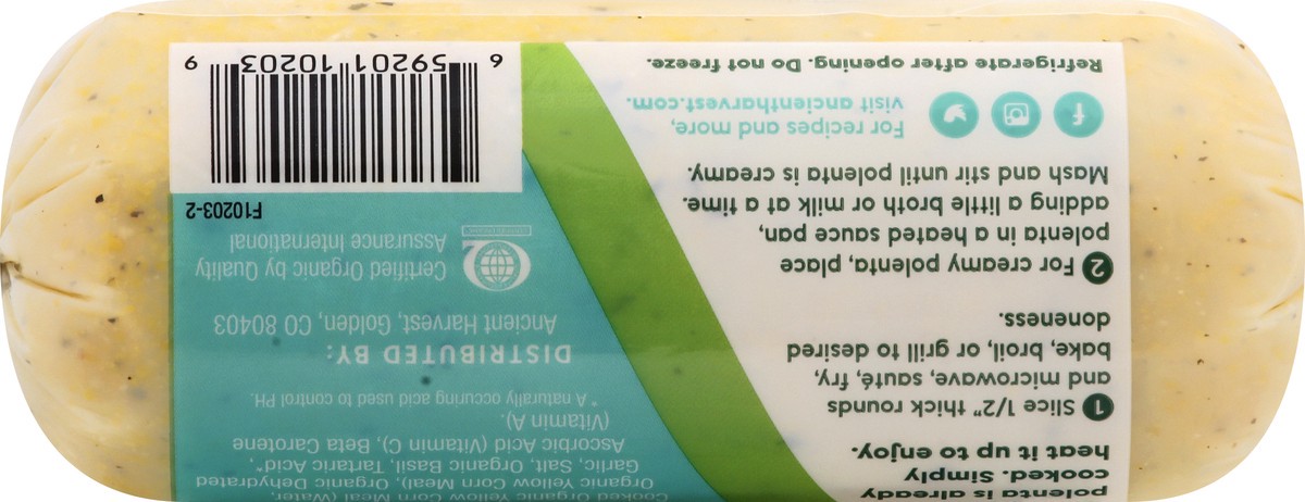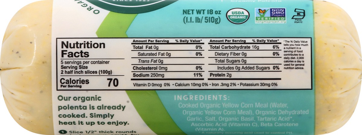 Cooked Organic Yellow Corn Meal (Water, Organic Yellow Corn Meal), Organic Dehydrated Garlic, Salt, Organic Basil, Tartaric Acid (a Naturally Occurring Acid Used to Control pH), Ascorbic Acid (Vitamin…