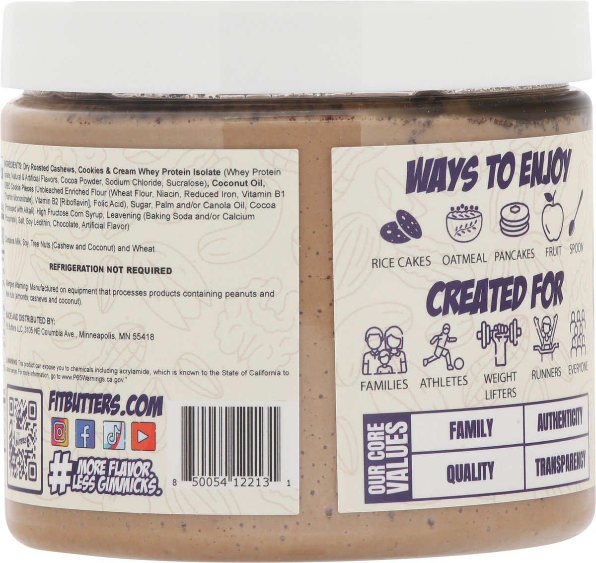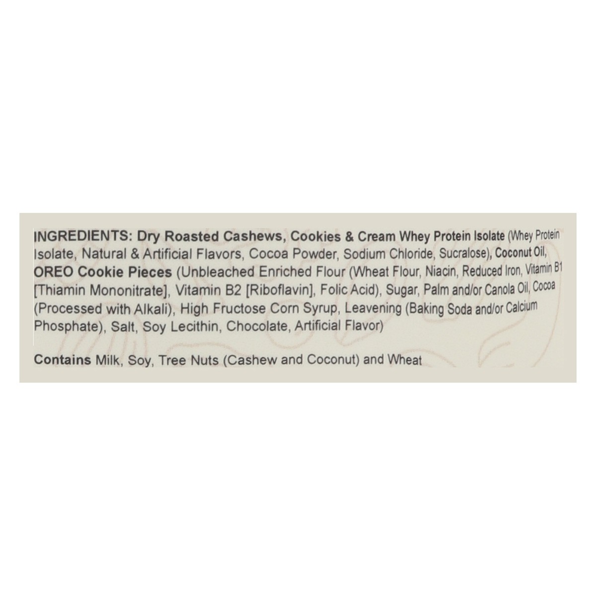Dry Roasted Cashews, Cookies & Cream Whey Protein Isolate (Whey Protein Isolate, Natural & Artificial Flavors, Cocoa Powder, Sodium Chloride, Sucralose), Coconut Oil, Oreo Cookie Pieces (Unbleached En…