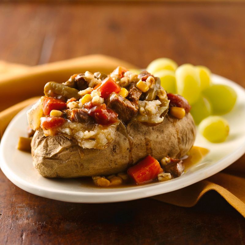 - SAVORY BEEF BARLEY VEGETABLE SOUP: Enjoy every bite of seasoned beef, barley, carrots, tomatoes and green beans in a rich beef broth