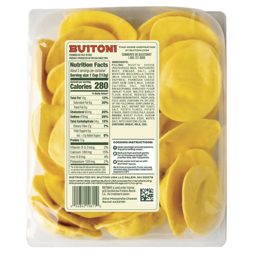 Introducing NEW Buitoni Mozzarella Cheese Ravioli! Stuffed with ricotta, whole milk mozzarella, and parmesan cheeses, it''s perfect for the whole family to enjoy. Made with imported Italian ''00'' flo…