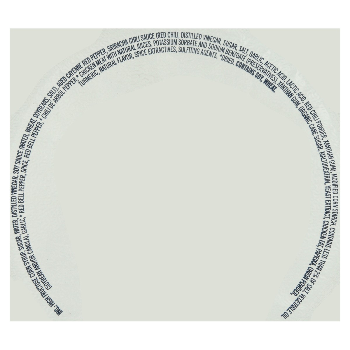 High Fructose Corn Syrup, Sugar, Water, Distilled Vinegar, Soy Sauce (Water, Wheat, Soybeans, Salt), Aged Cayenne Red Pepper, Sriracha Chili Sauce (Red Chili, Distilled Vinegar, Sugar, Salt, Garlic, A…