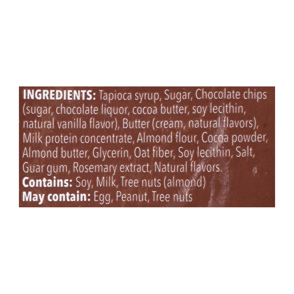 Tapioca Syrup, Sugar, Chocolate Chips (Sugar, Chocolate Liquor, Cocoa Butter, Soy Lecithin, Natural Vanilla Flavor), Butter (Cream, Natural Flavors), Milk Protein Concentrate, Almond Flour, Cocoa Powd…