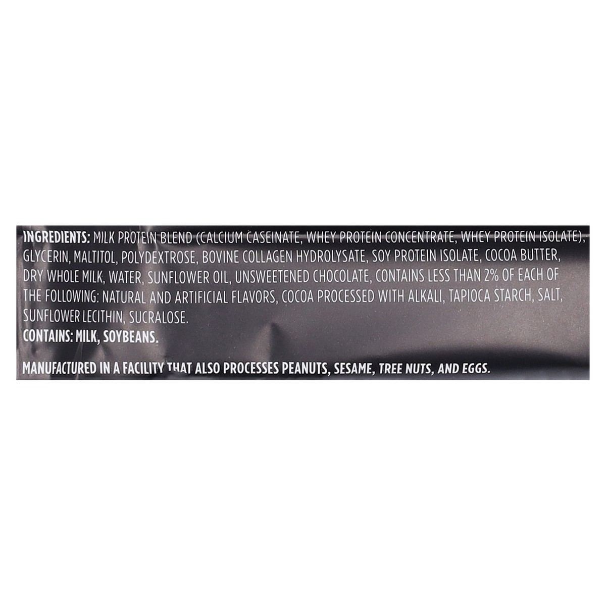 Milk Protein Blend (Calcium Caseinate, Whey Protein Concentrate, Whey Protein Isolate), Glycerin, Maltitol, Polydextrose, Bovine Collagen Hydrolysate, Soy Protein Isolate, Cocoa Butter, Dry Whole Milk…
