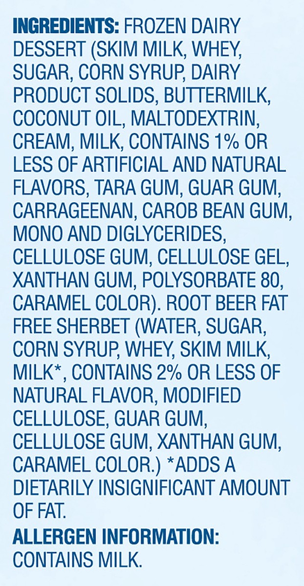 Frozen Dairy Dessert (Skim Milk, Whey, Sugar, Corn Syrup, Dairy Product Solids, Buttermilk, Coconut Oil, Maltodextrin, Cream, Milk, Contains 1% or Less of Artificial and Natural Flavors, Tara Gum, Gua…