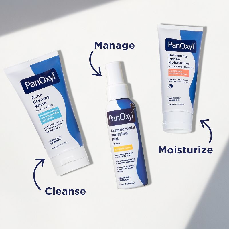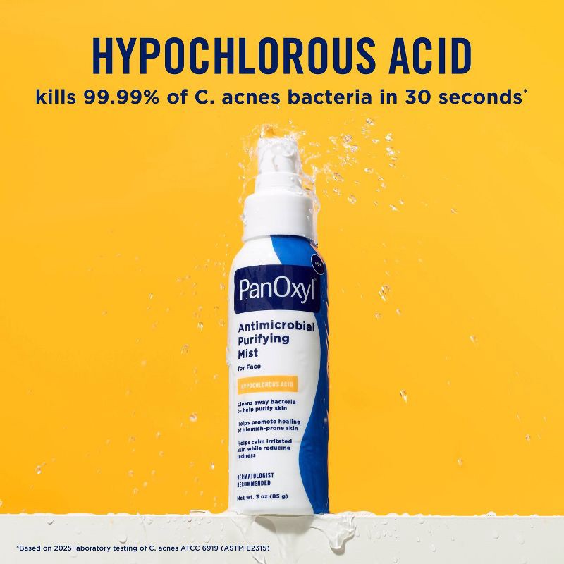 Help clarify and purify blemish-prone skin with PanOxyl Antimicrobial Purifying Mist. This multi-tasking antimicrobial solution contains Hypochlorous Acid, which helps kill bacteria and minimize the l…