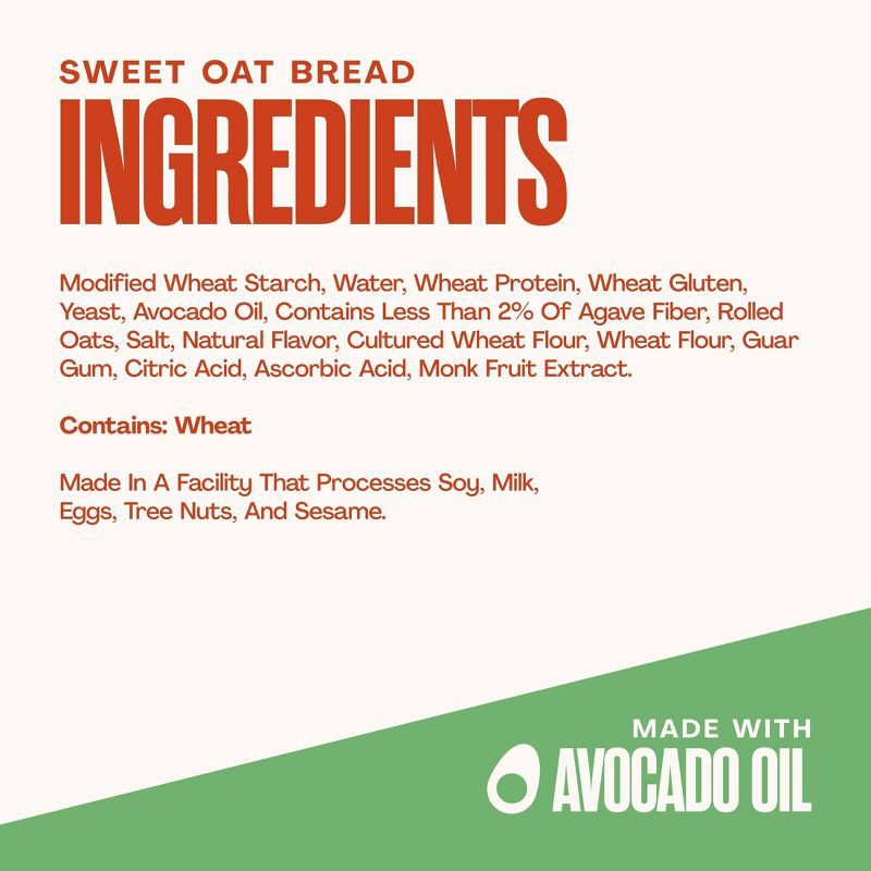 MODIFIED WHEAT STARCH, WATER, WHEAT PROTEIN, WHEAT GLUTEN, YEAST, AVOCADO OIL, CONTAINS LESS THAN 2% OF AGAVE FIBER, ROLLED OATS, SALT, NATURAL FLAVOR, CULTURED WHEAT FLOUR, WHEAT FLOUR, GUAR GUM, CIT…