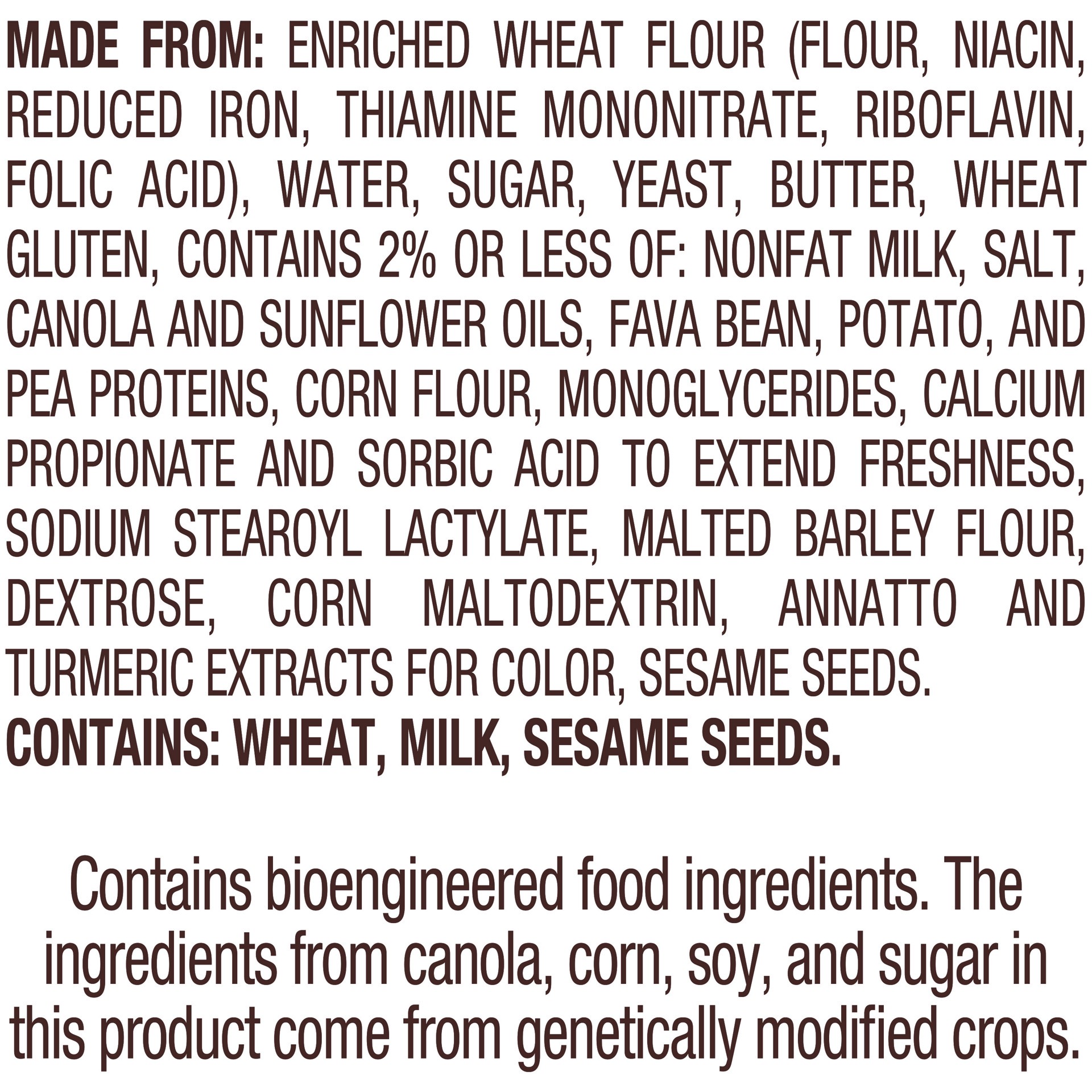MADE FROM: ENRICHED WHEAT FLOUR (FLOUR, NIACIN, REDUCED IRON, THIAMINE MONONITRATE, RIBOFLAVIN, FOLIC ACID), WATER, SUGAR, YEAST, BUTTER, WHEAT GLUTEN, CONTAINS 2% OR LESS OF: NONFAT MILK, SALT, CANOL…
