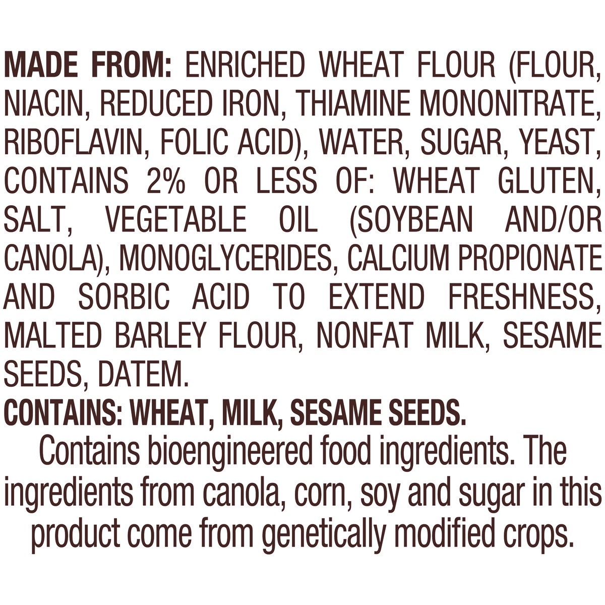 MADE FROM: ENRICHED WHEAT FLOUR (FLOUR, NIACIN, REDUCED IRON, THIAMINE MONONITRATE, RIBOFLAVIN, FOLIC ACID), WATER, SUGAR, YEAST, CONTAINS 2% OR LESS OF: WHEAT GLUTEN, SALT, VEGETABLE OIL (SOYBEAN AND…
