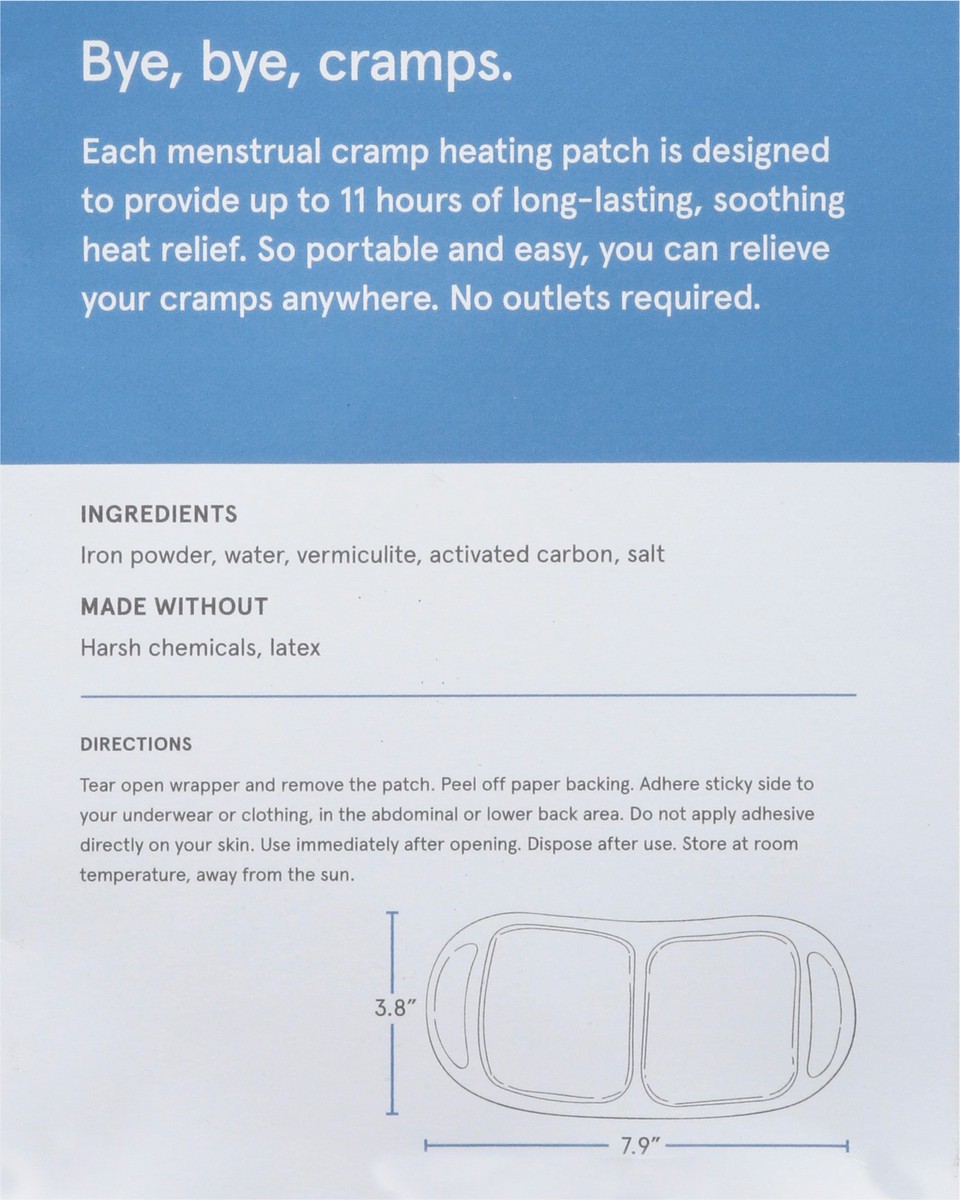 Calm those cramps, naturally. Made to soothe your PMS discomfort, each heating patch lasts for up to 11 hours. So discreet and easy to wear, you're free to go anywhere. Even if that's just to the couc…