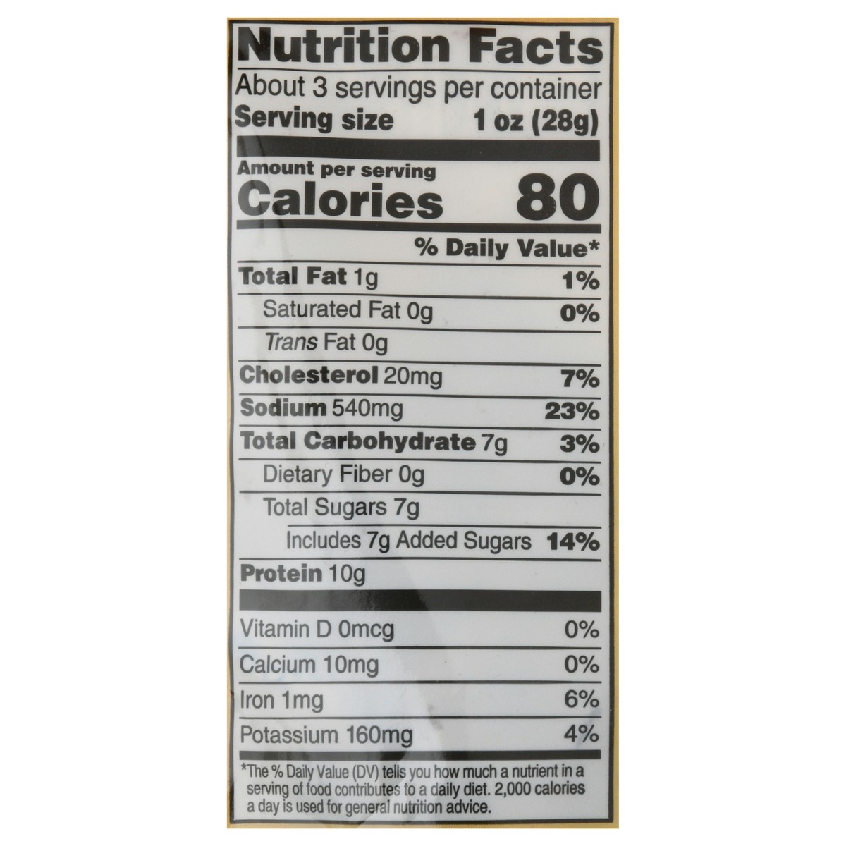 Made from 96% lean beef. Per 1 oz: 80 calories; 0 g sat fat (0% DV); 540 mg sodium (23% DV); 7 g total sugars. 100% Satisfaction Guarantee: Our Quality Commitment: If not 100% satisfied, return unused…