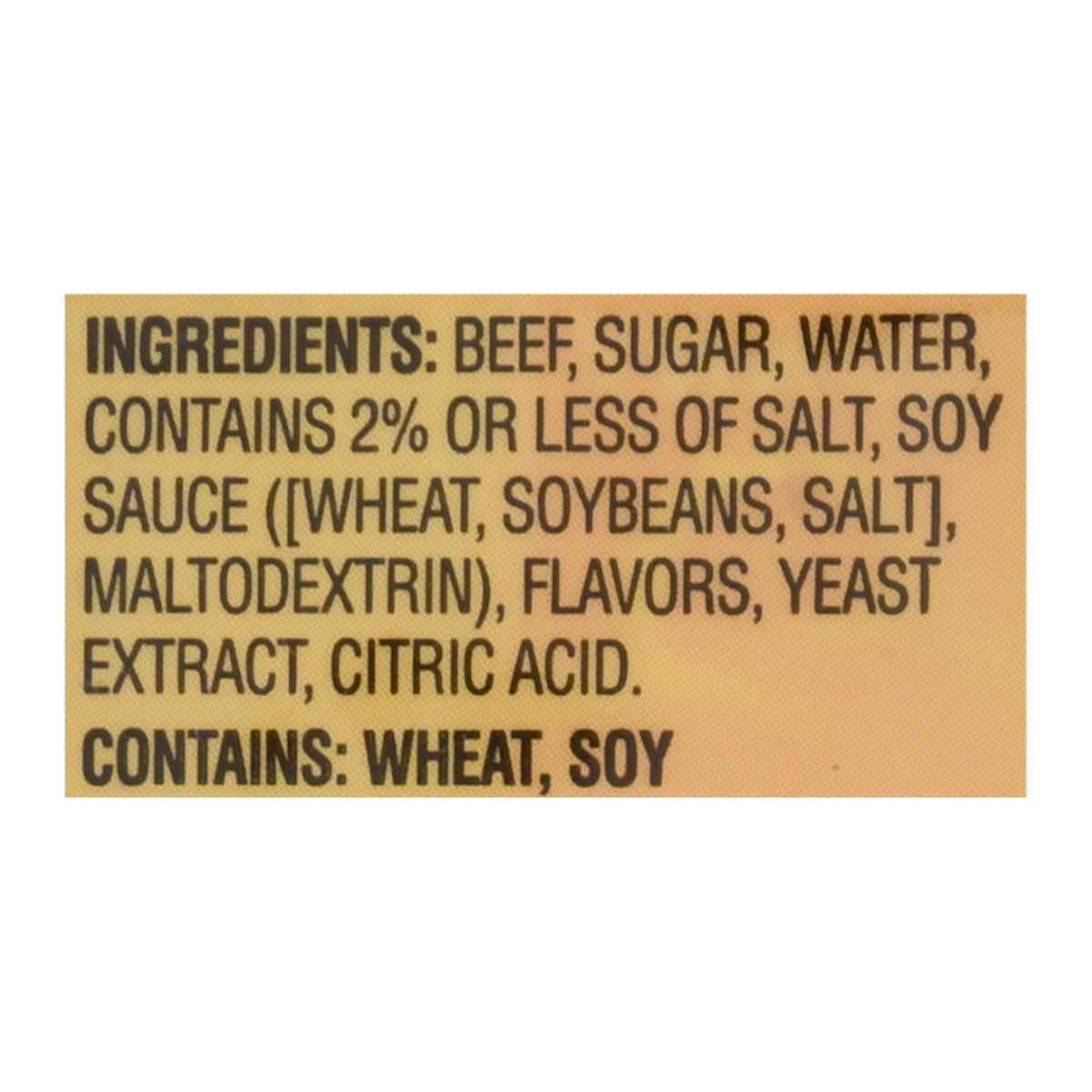 Beef, Sugar, Water, Contains 2% or Less of Salt, Soy Sauce ([Wheat, Soybeans, Salt], Maltodextrin), Flavors, Yeast Extract, Citric Acid.