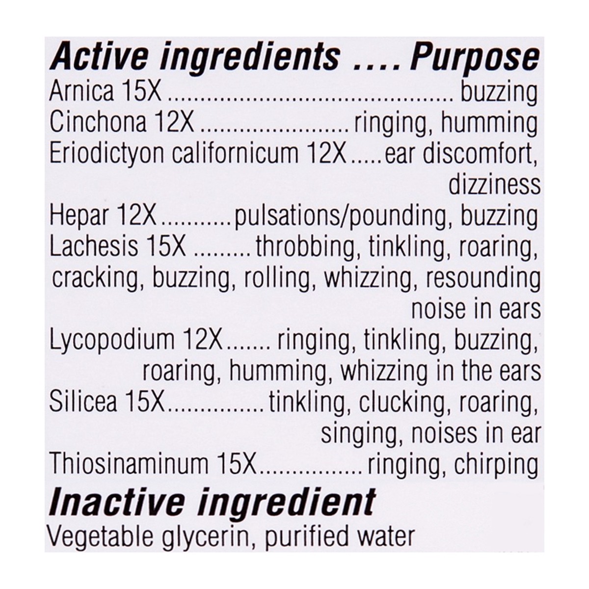Active Ingredients: Arnica 15X, Buzzing; Cinchona 12X, Ringing, Humming; Eriodictyon Californicum 12X, Ear Discomfort, Dizziness; Hepar 12X, Pulsations/Pounding, Buzzing; Lachesis 15X, Throbbing, Tink…