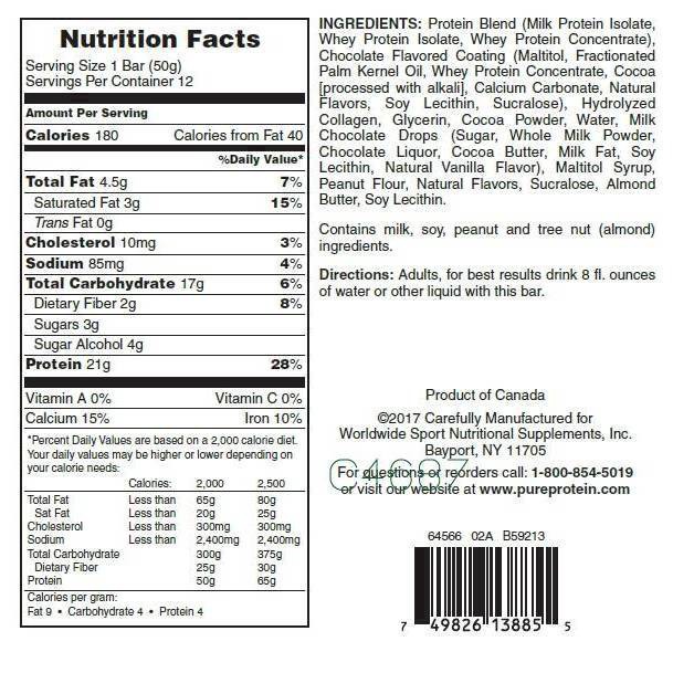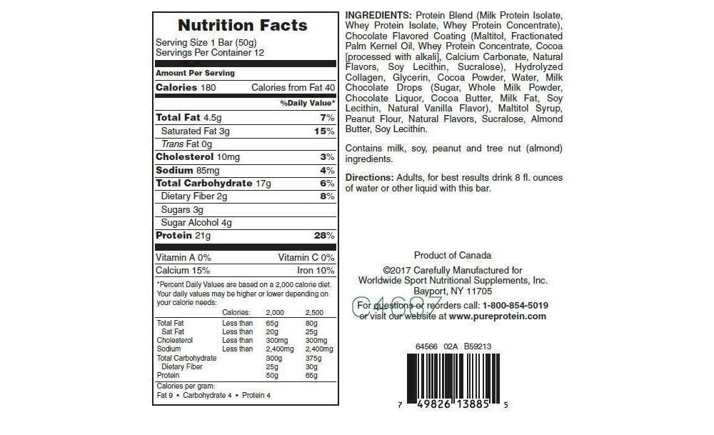 21 g; 3 g sugar; 180 calories. Gluten free. Partially produced with genetic engineering. For questions or reorders call: 1-800-854-5019 or visit our website at www.pureprotein.com. Product of Canada.