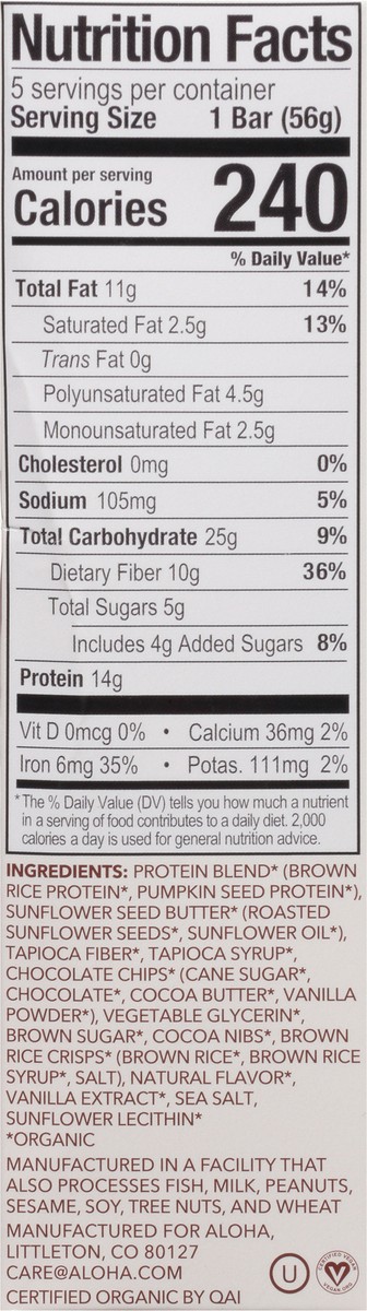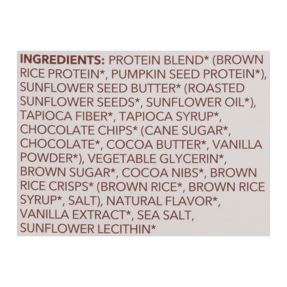 Protein Blend* (Brown Rice Protein*, Pumpkin Seed Protein*), Sunflower Seed Butter* (Roasted Sunflower Seeds*, Sunflower Oil*), Tapioca Fiber*, Tapioca Syrup*, Chocolate Chips* (Chocolate*, Cane Sugar…