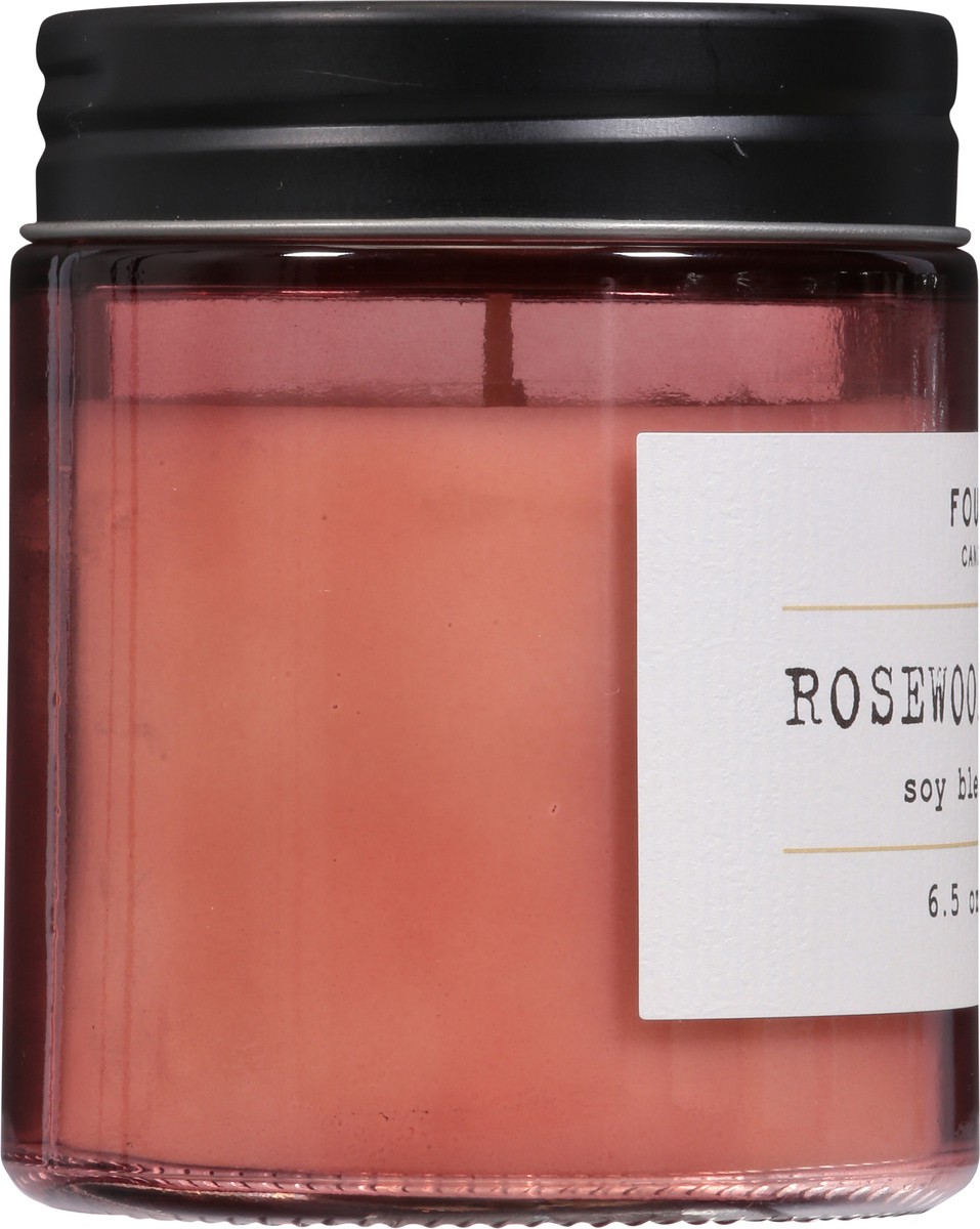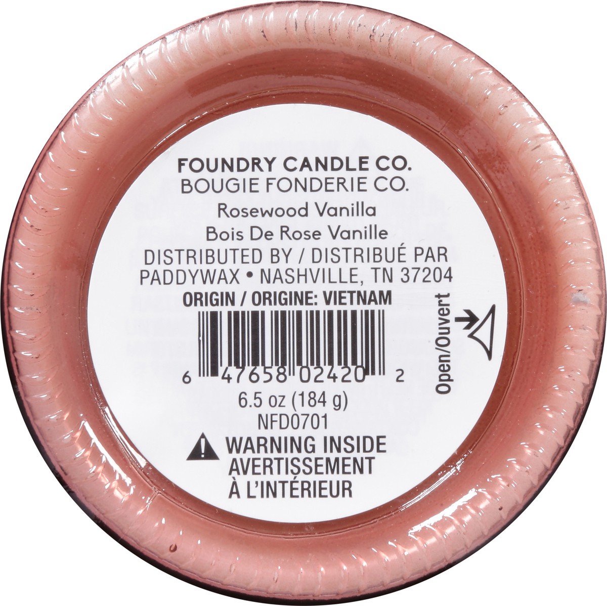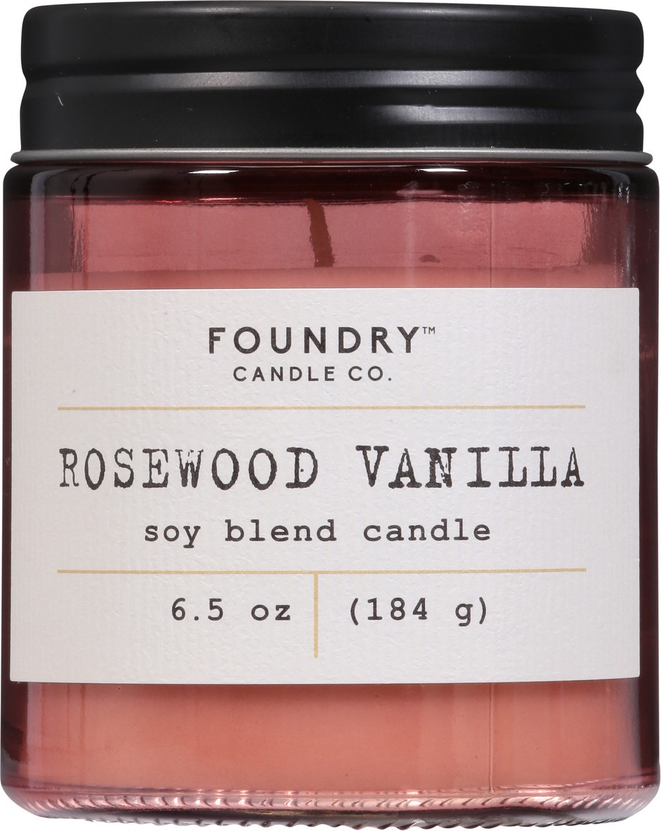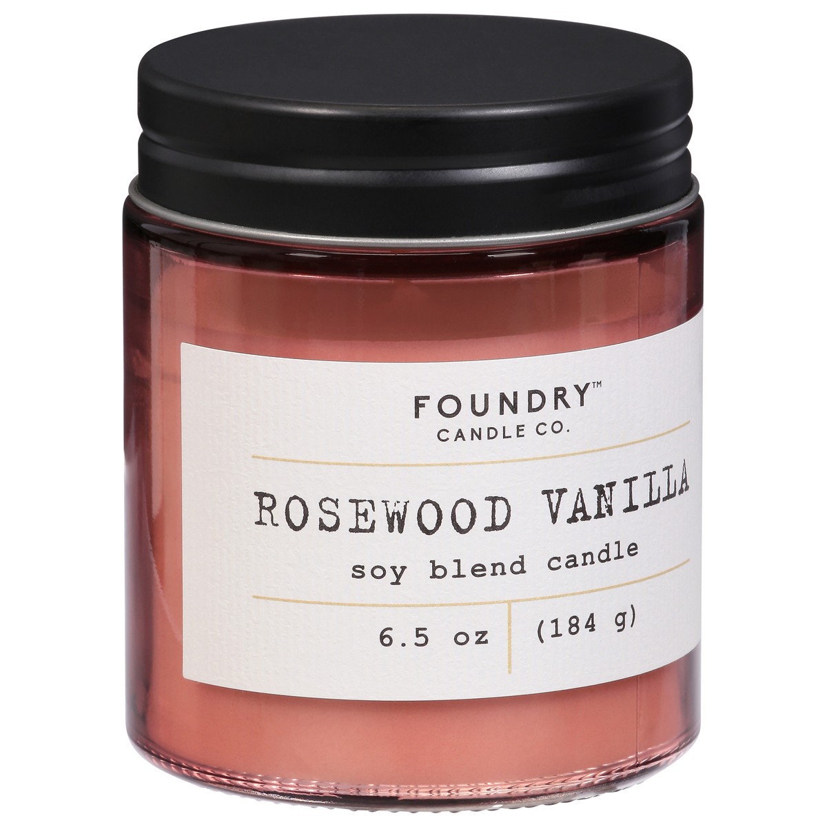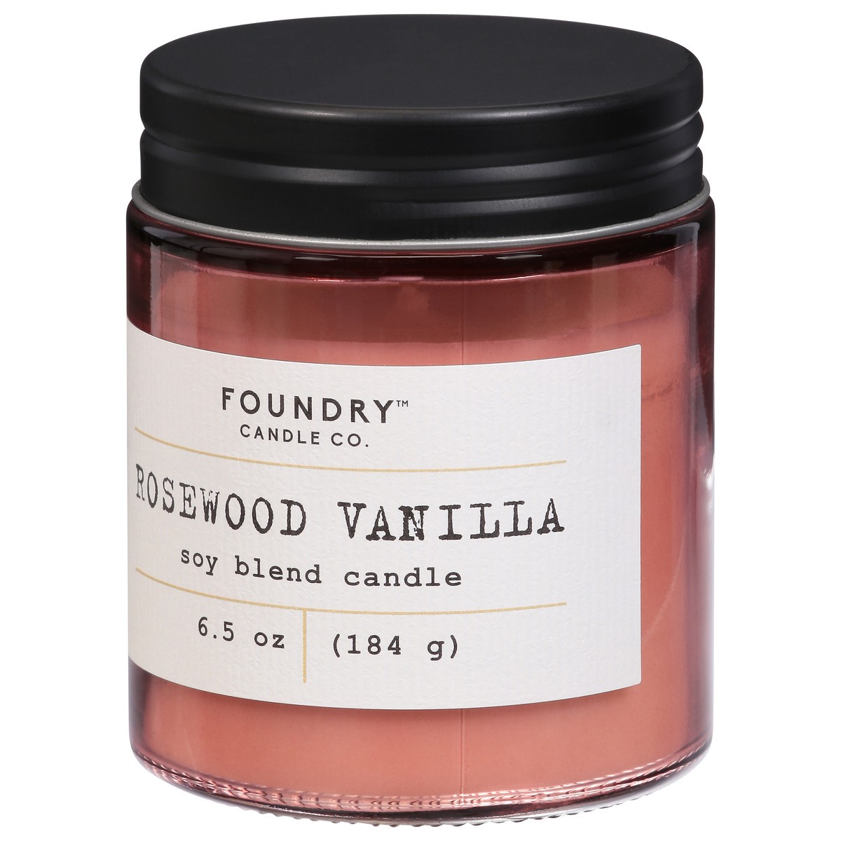 Foundry's Rosewood Vanilla 6.5 oz. soy-wax blended candle with a cotton wick features fragrance notes of rose geranium, cedar leaf, and sandalwood. Our transparent rust glass jar with a screw on matteā¦