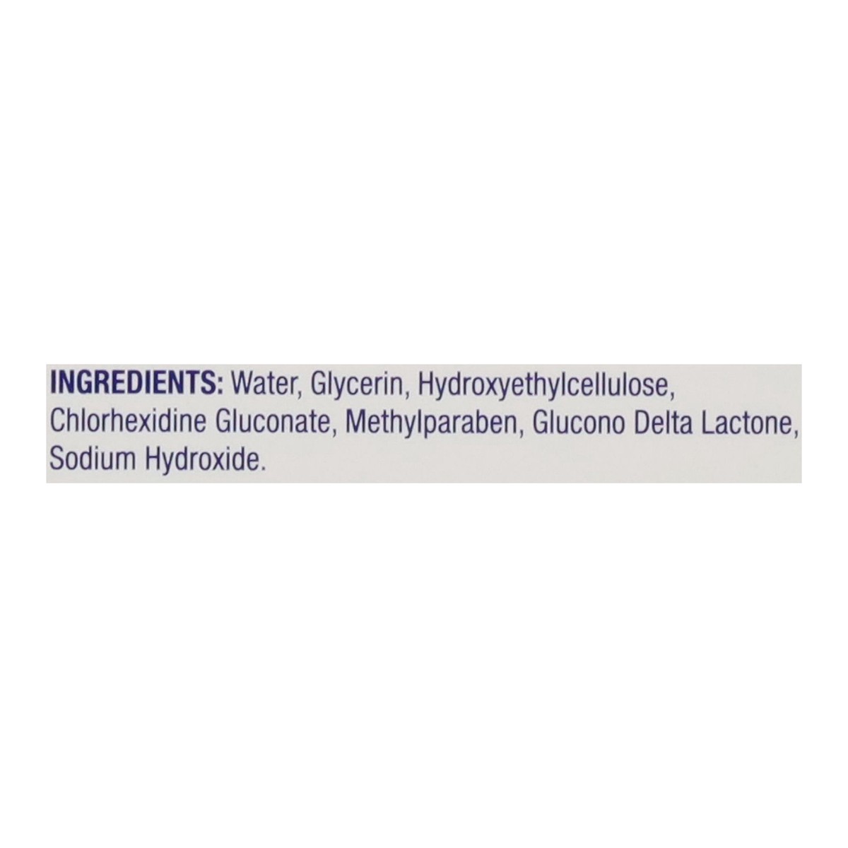 Water, Glycerin, Hydroxyethylcellulose, Chlorhexidine Gluconate, Methylparaben, Glucono Delta Lactone, Sodium Hydroxide.