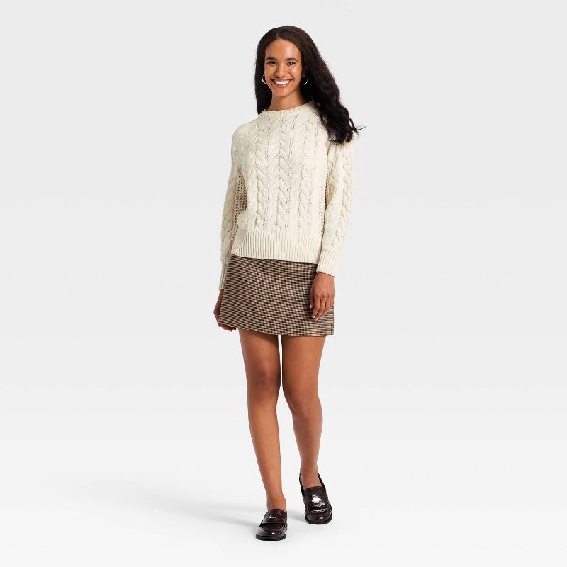 Women's Long Sleeve Round Neck Cable Sweater - A New Day™ Cream M