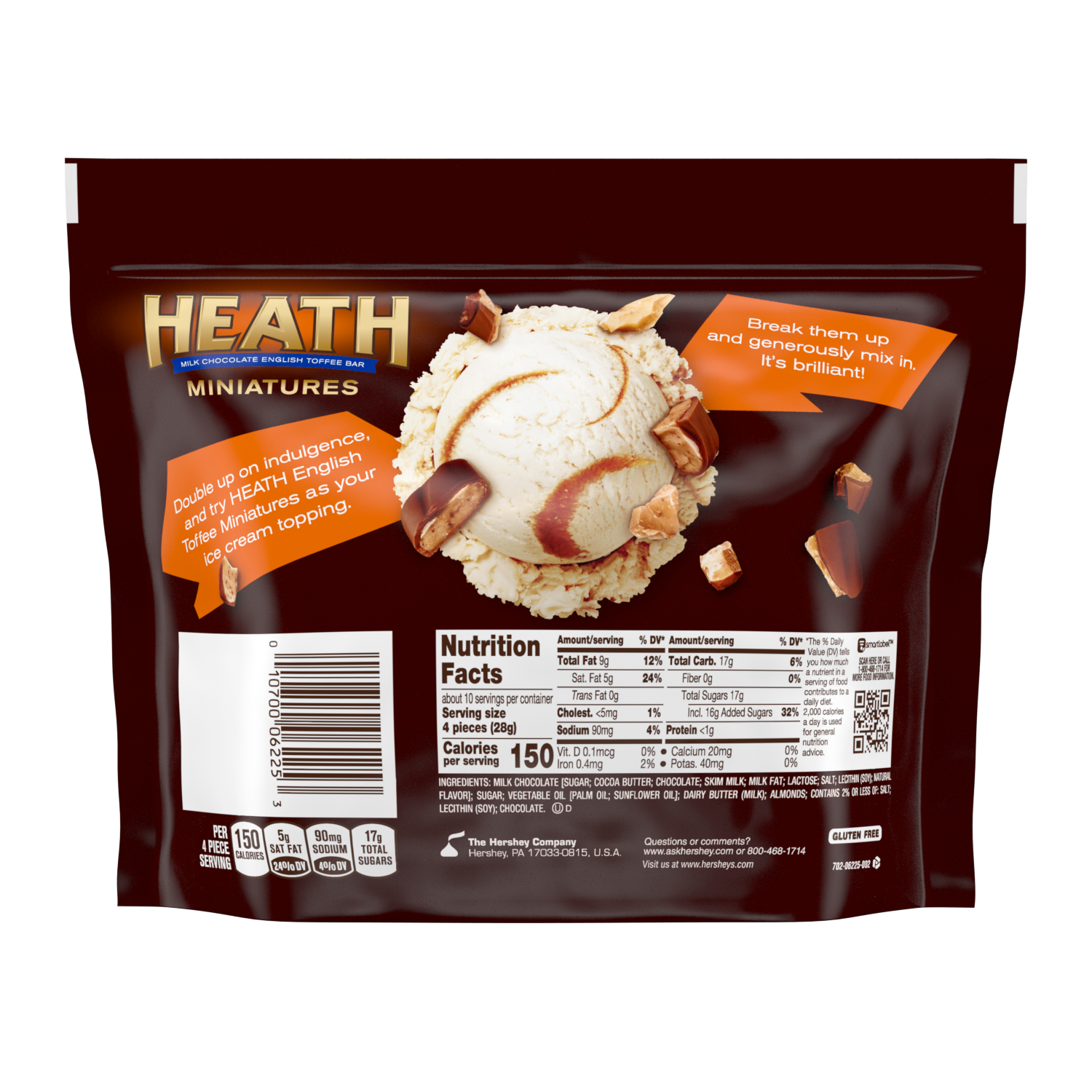HEATH mini chocolate toffee candy bars are the perfect treat to keep stocked in snack cabinets, work desk drawers and anywhere else your appetite might show up. These crunchy English toffee and milk c…