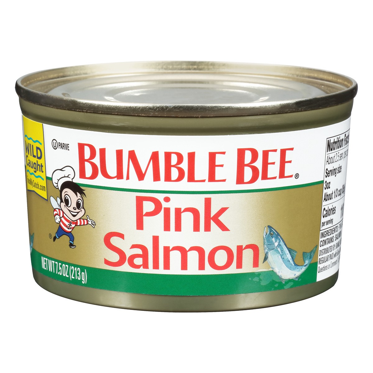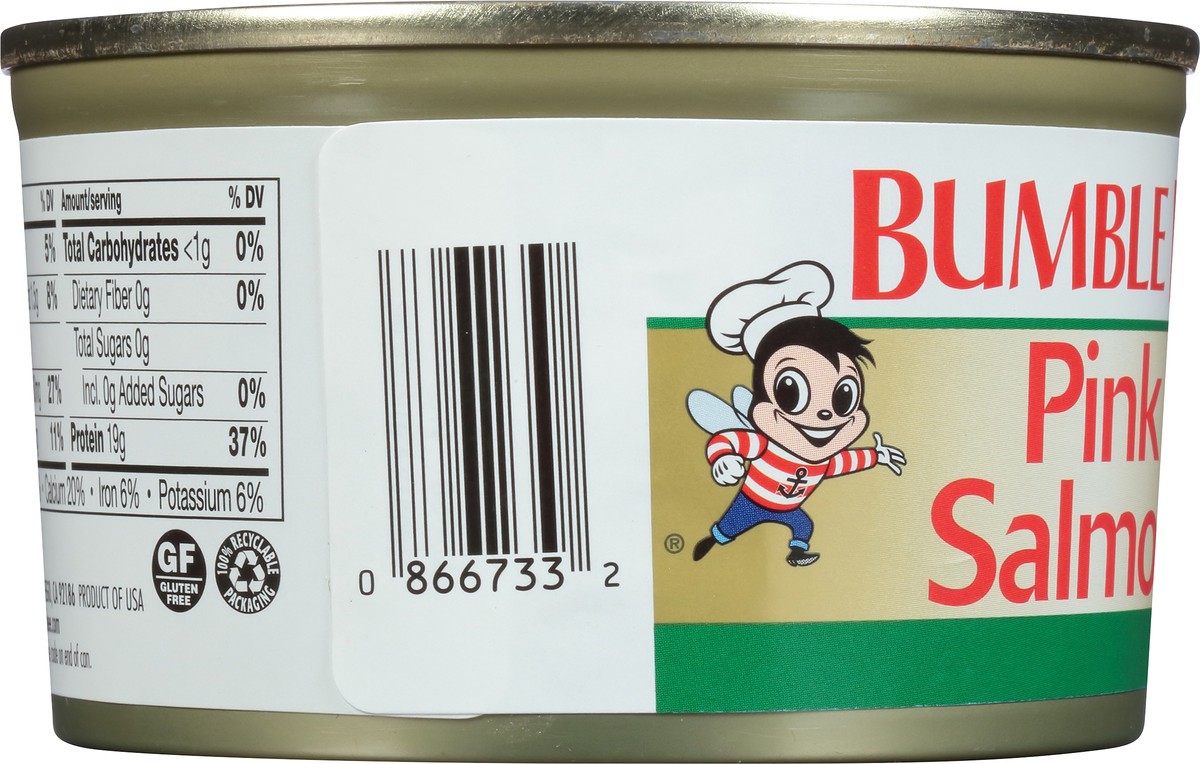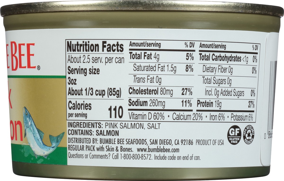 Gluten free. Regular pack with skin & bones. www.bumblebee.com. Questions or Comments? Call 1-800-800-8572. Include code on end of can. Wild caught. TraceMyCatch.com. 100% recyclable packaging.