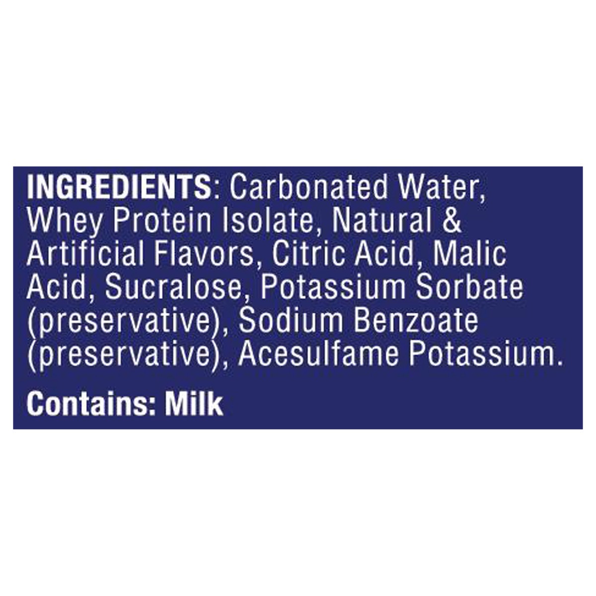 Carbonated Water, Whey Protein Isolate, Natural & Artificial Flavors, Citric Acid, Malic Acid, Sucralose, Potassium Sorbate (Preservative), Sodium Benzoate (Preservative), Acesulfame Potassium.