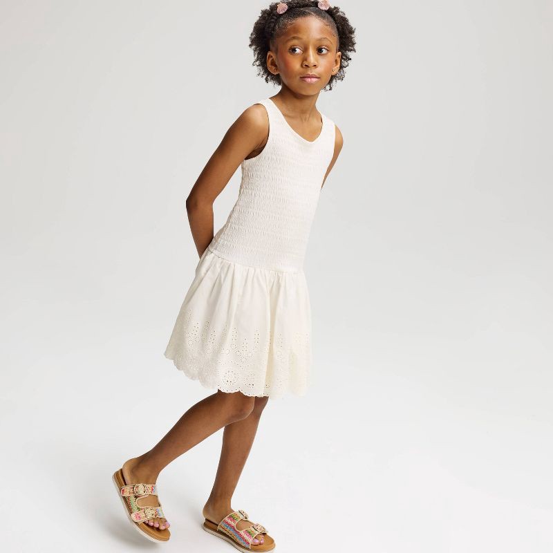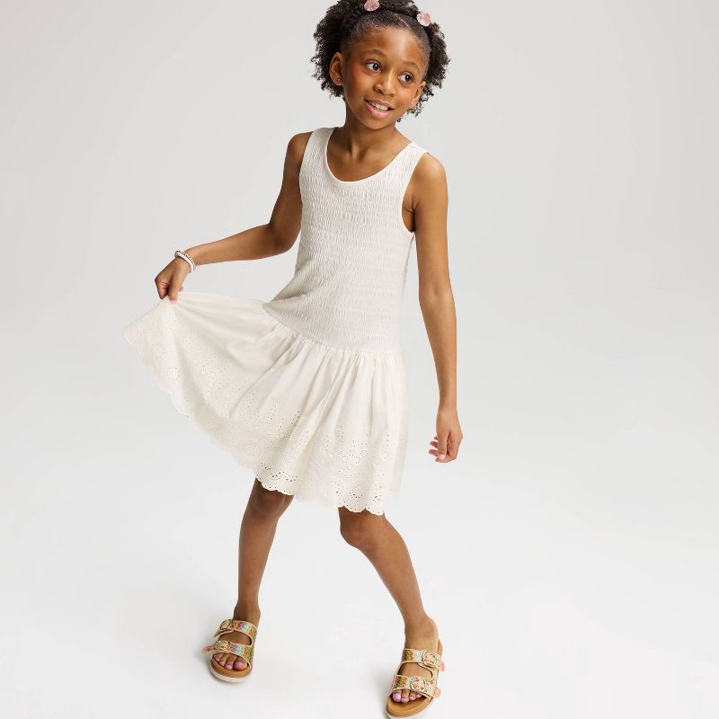 Lend a charming touch to your kid's casual wardrobe with this Drop Waist Eyelet Bubble Hem Dress from Cat & Jack™. The sleeveless dress is made from a mix of cotton, recycled polyester and spandex jac…