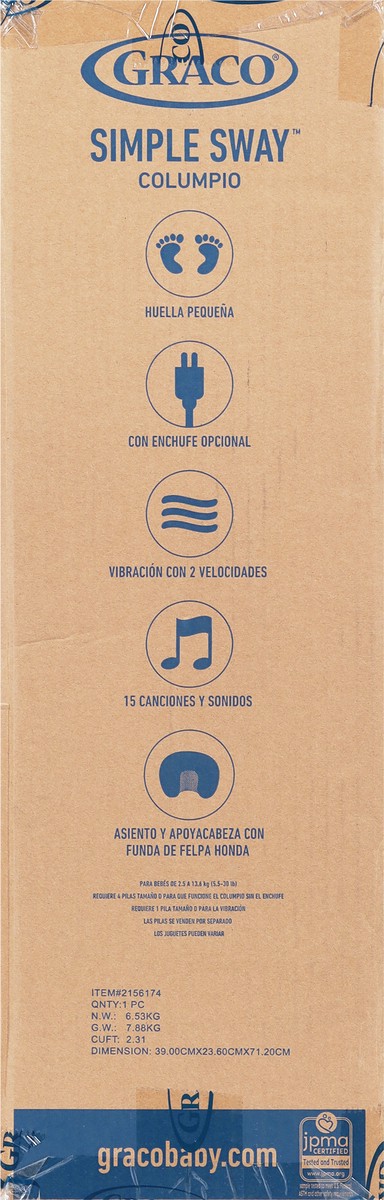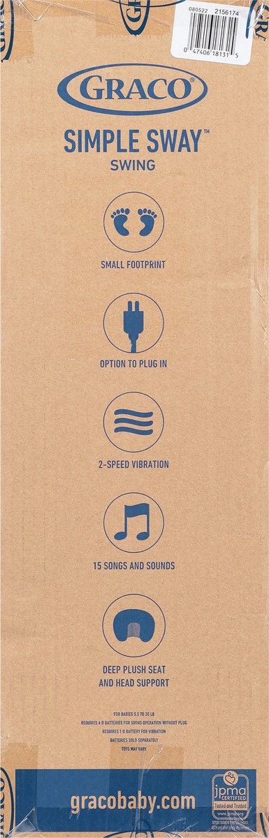 Small footprint. Option to plug in. 2-speed vibration. Option to plug in. 15 songs and sounds. Deep plush seat and head support. For babies 5.5 to 30 lb. Requires 4 D batteries for swing operation wit…