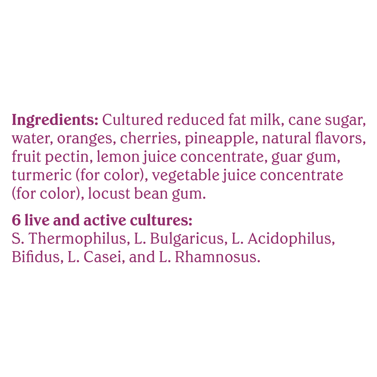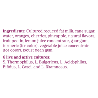 Cultured Reduced Fat Milk\, Cane Sugar\, Water\, Oranges\, Cherries\, Pineapple\, Natural Flavors\, Fruit Pectin\, Lemon Juice Concentrate\, Guar Gum\, Turmeric (for Color)\, Vegetable Juice Concentra…