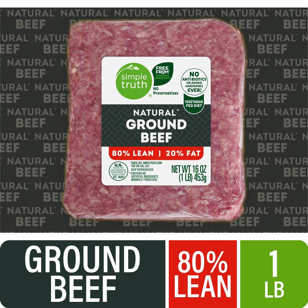 Simple Truth® 80/20 Naturalˆ Ground Beef Pack 1 LB redefines your meat experience with quality you can bank on. Taste the difference when vegetarian fed meat meets no preservatives. 80% lean and 20% f…