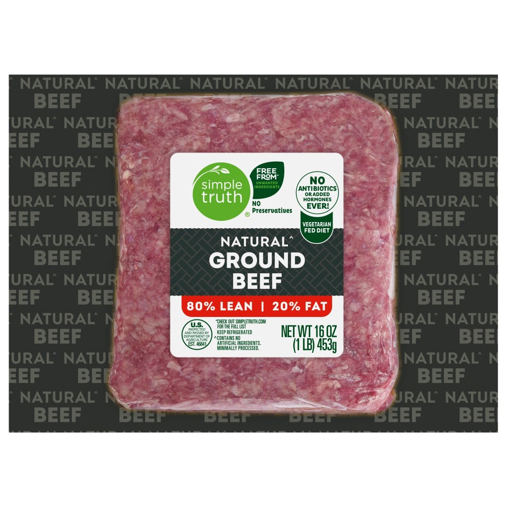 Simple Truth® 80/20 Naturalˆ Ground Beef Pack 1 LB redefines your meat experience with quality you can bank on. Taste the difference when vegetarian fed meat meets no preservatives. 80% lean and 20% f…