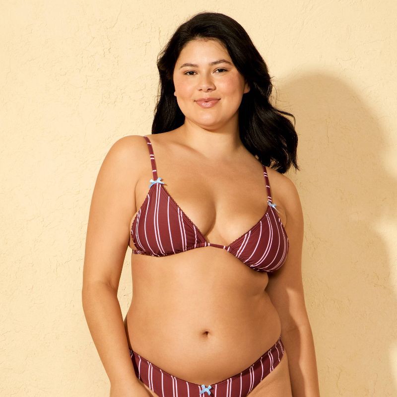 Tricot triangle bikini top from Wild Fable™ adorned with light pink stripes on a dark brown background. Made from nylon fabric with spandex and full lining for flexible comfort in and out of the water…