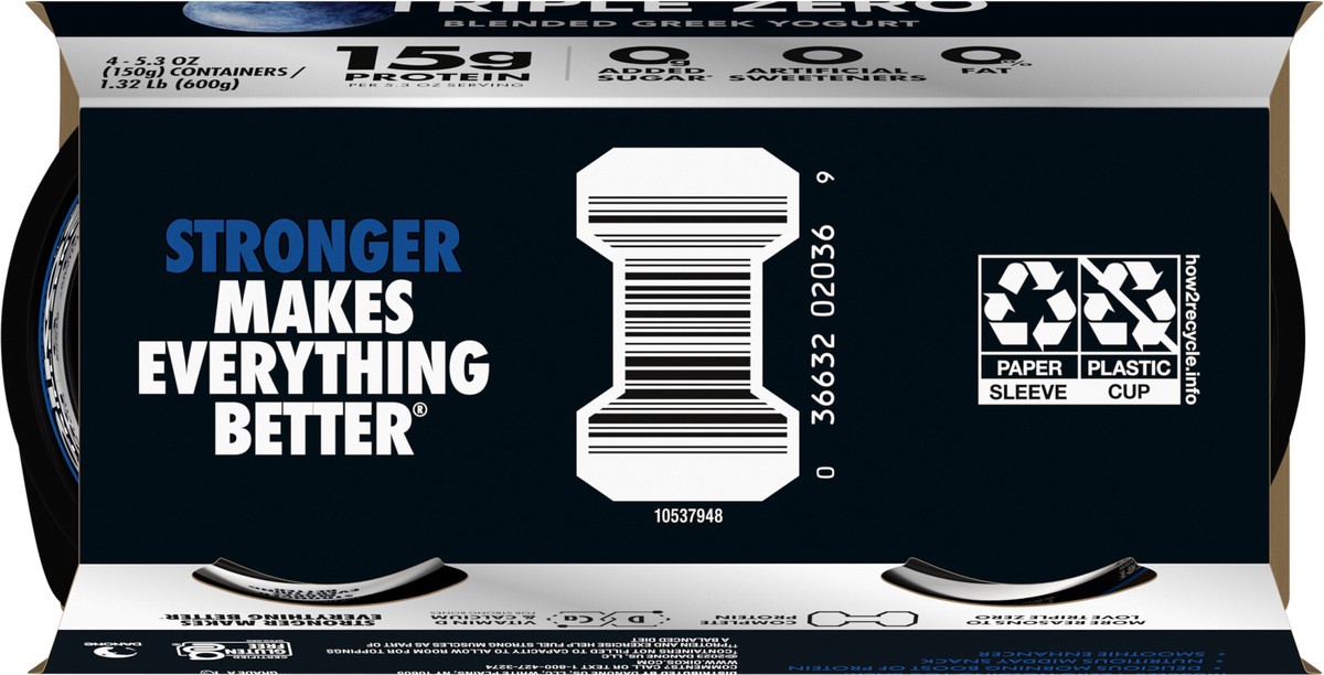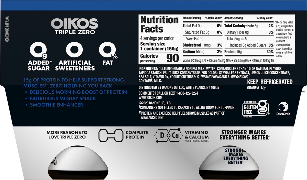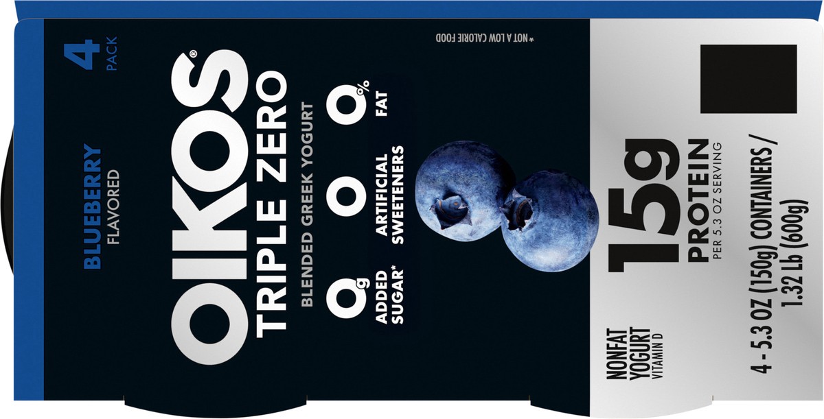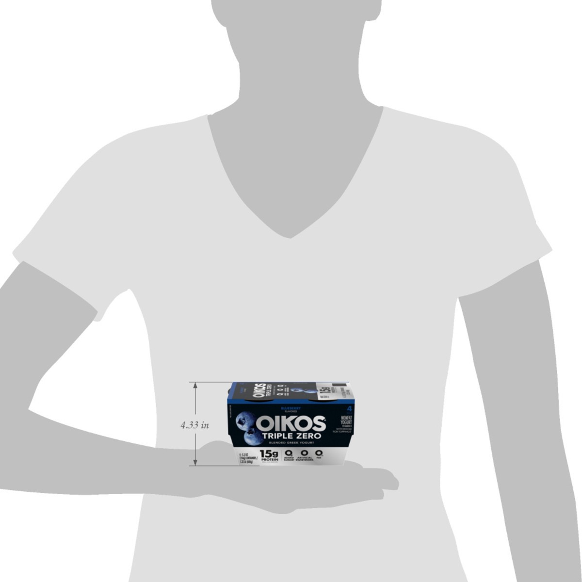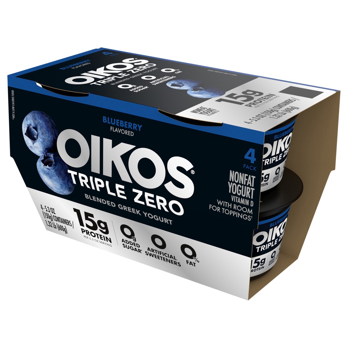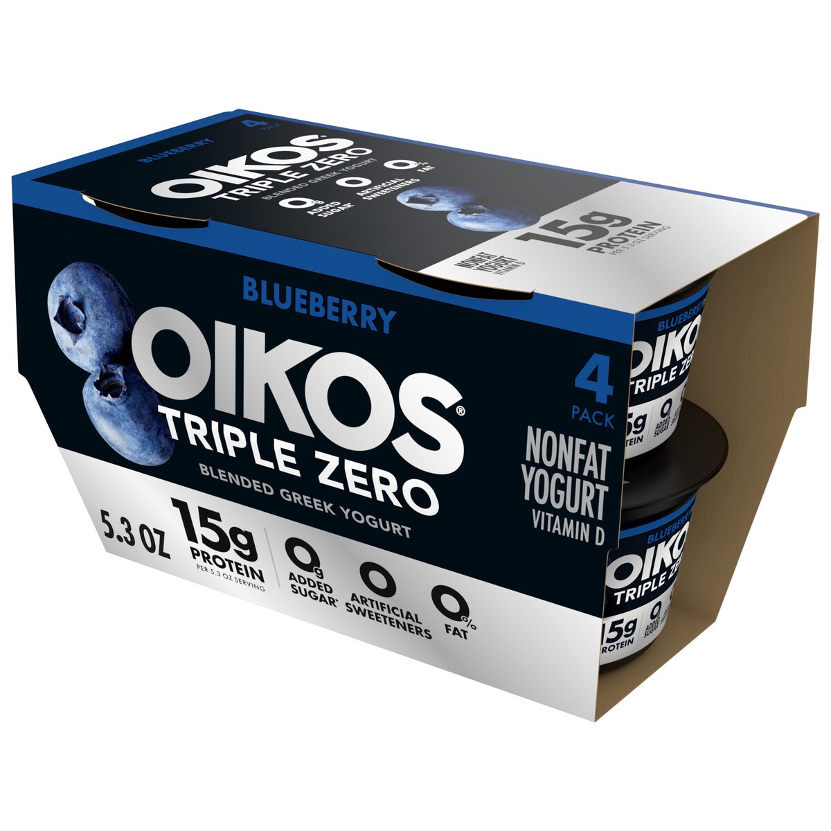 - STRONGER MAKES EVERYTHING BETTER: Four 5.3 oz yogurt cups of Oikos Triple Zero Blueberry, Nonfat Greek Yogurt