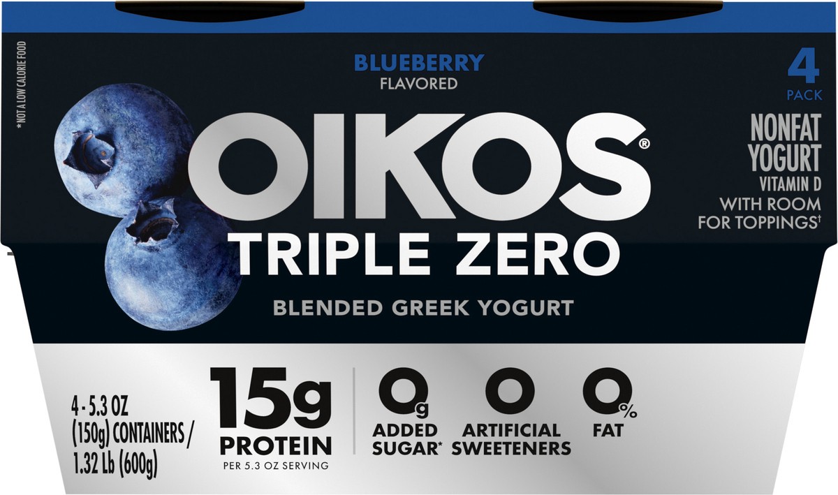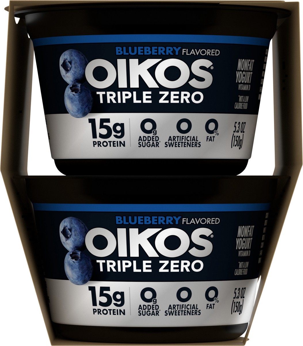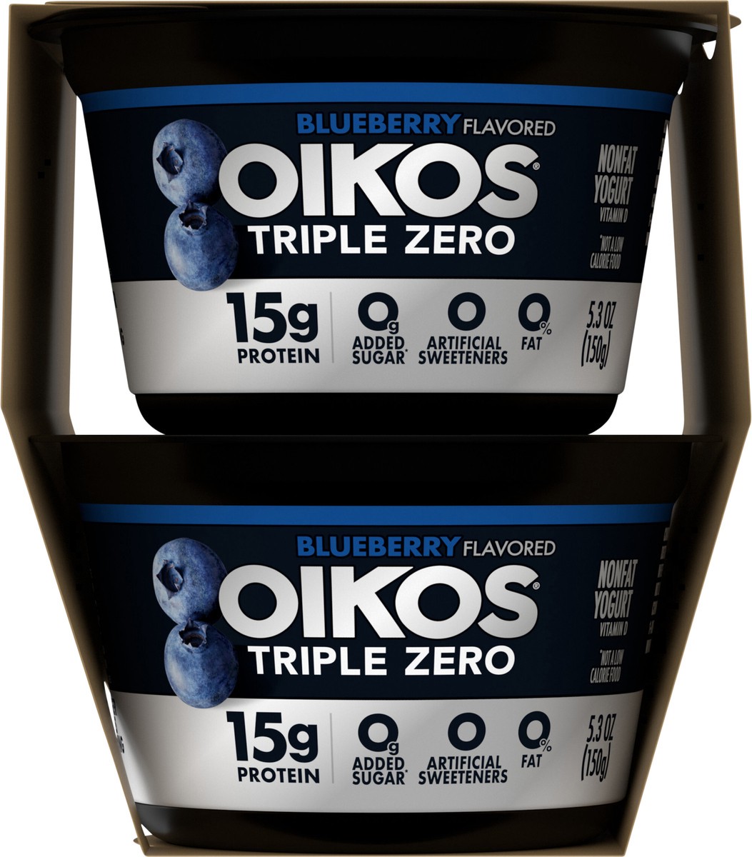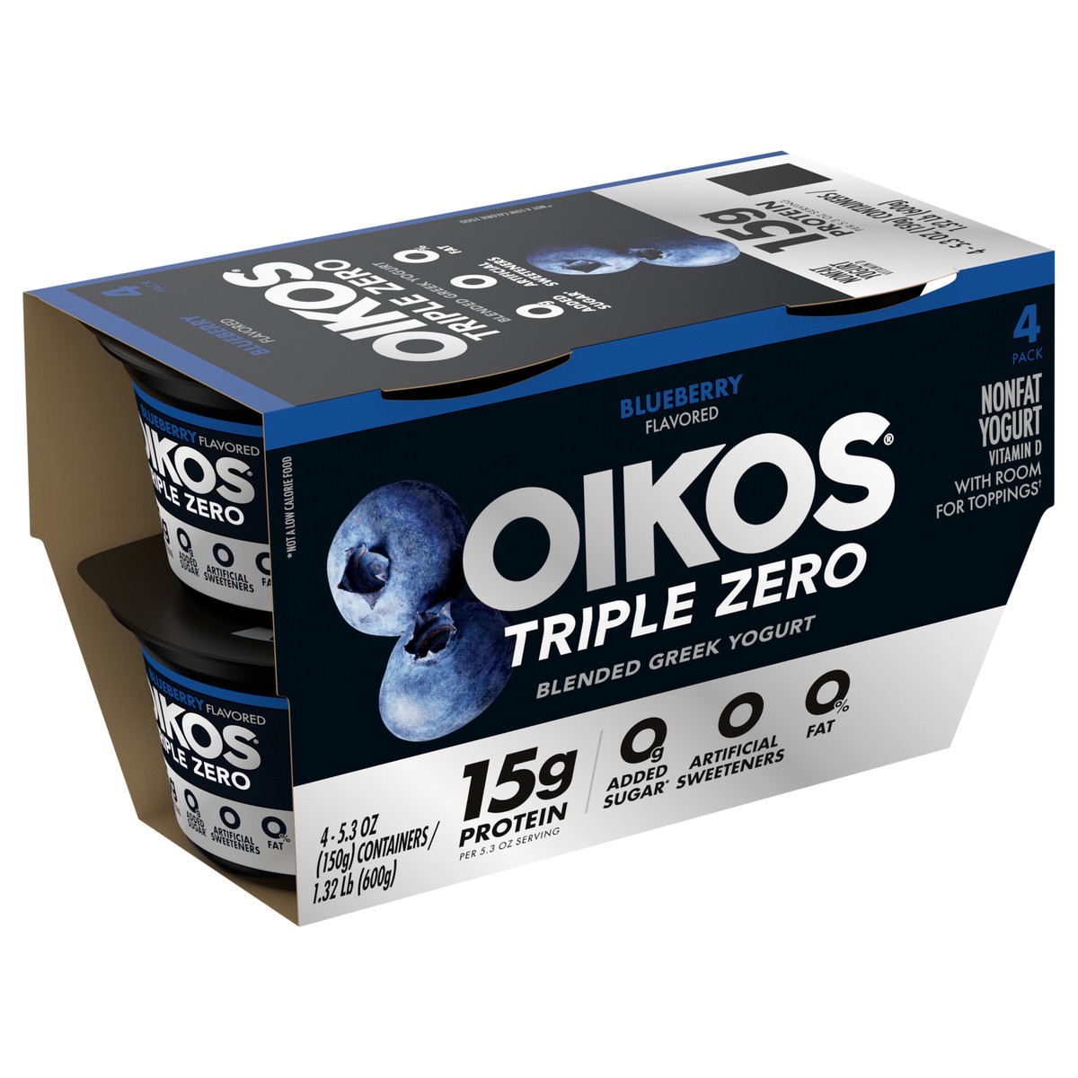 Enjoy epic tastes with Oikos Triple Zero Blueberry Nonfat Greek Yogurt Pack. With 15 grams of protein per serving, 0% fat, 0g added sugar* per 5.3 oz serving and 0 artificial sweeteners, enjoy your sn…