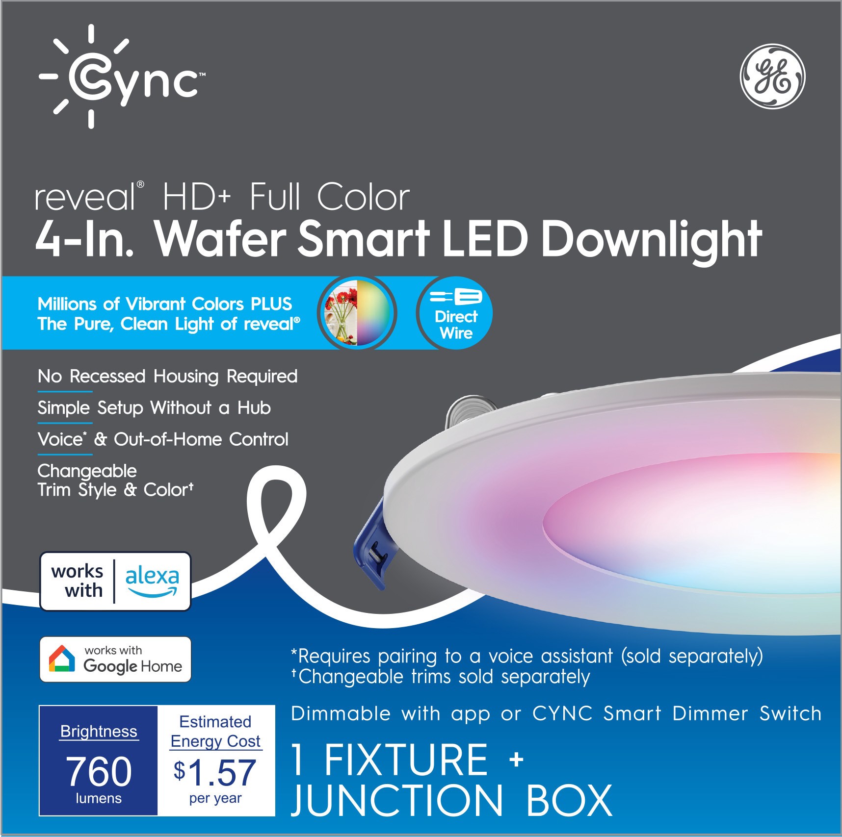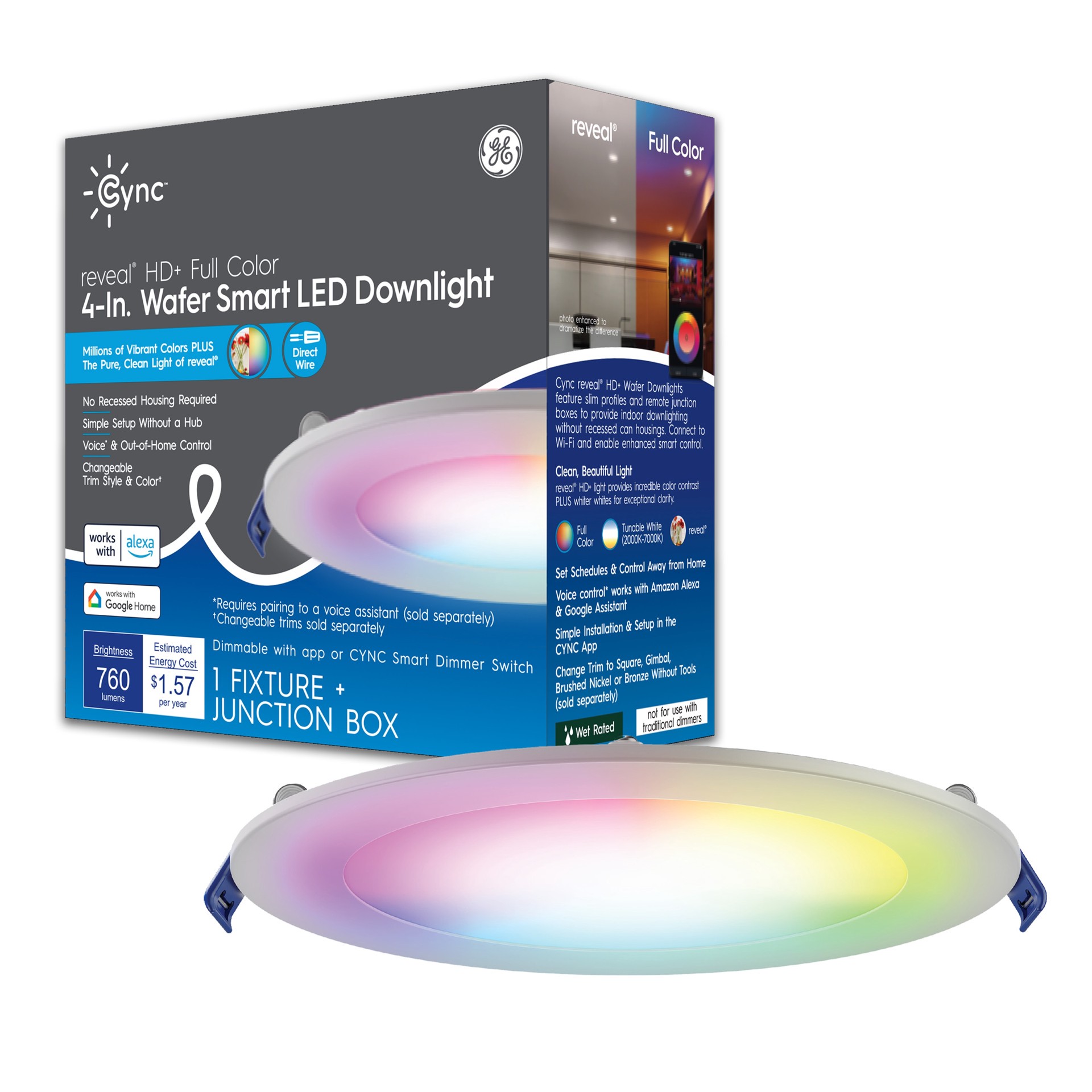 GE Cync Wafer Smart Compatible Bluetooth Compatibility White 4-in 760 -Lumens Switchable Round Dimmable LED Canless Wet rated Recessed Downlight