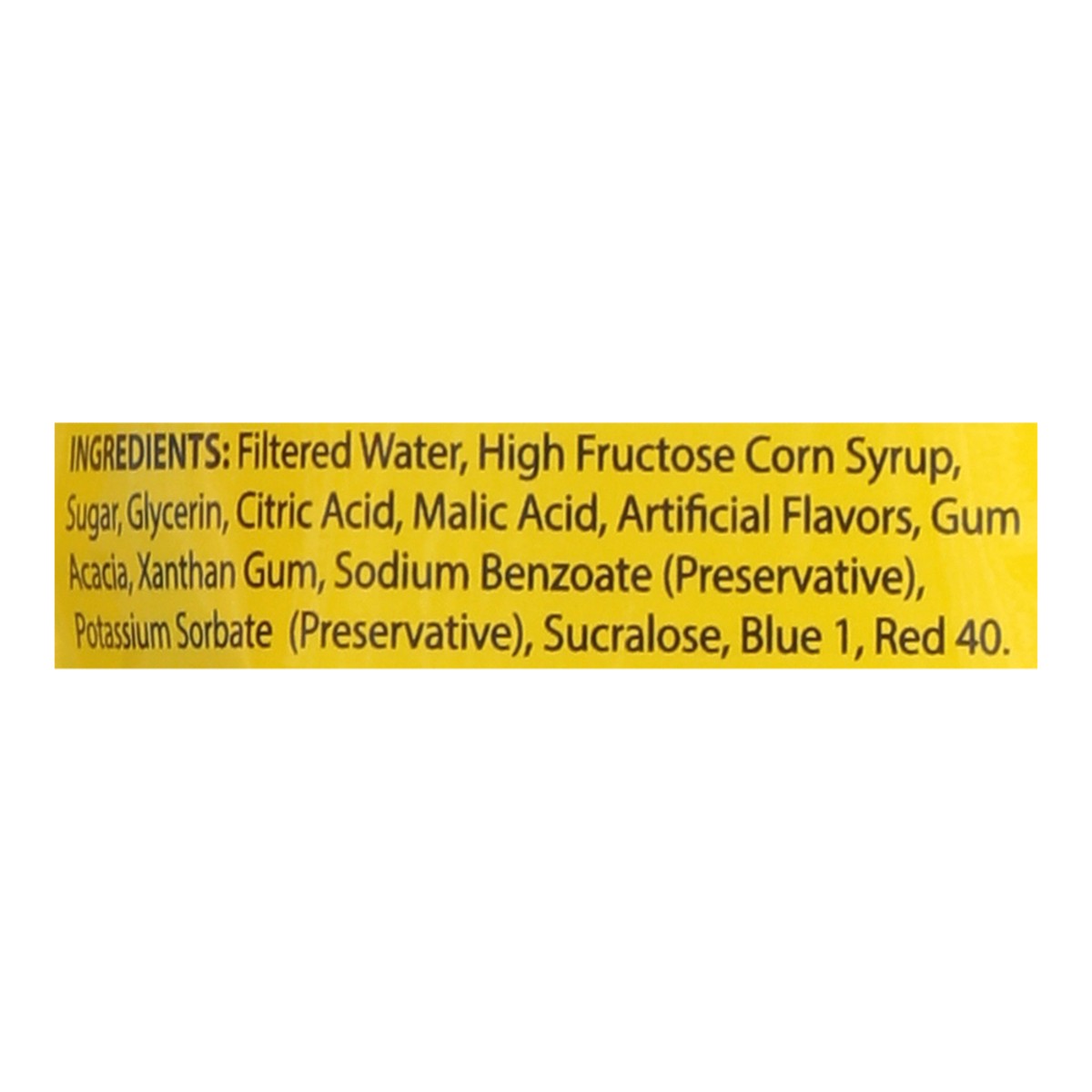 Filtered Water, High Fructose Corn Syrup, Sugar, Glycerin, Citric Acid, Malic Acid, Artificial Flavors, Gum Acacia, Xanthan Gum, Sodium Benzoate (Preservative), Potassium Sorbate (Preservative), Sucra…