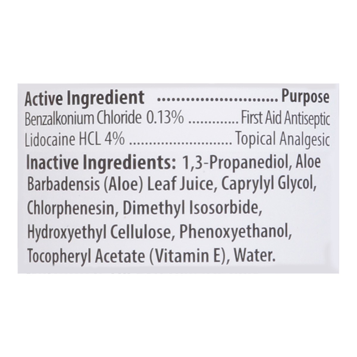 Active Ingredients: Benzalkonium Chloride (0.13 %), First Aid Antiseptic.; Lidocaine HCI (4 %), Topical Analgesic. Inactive Ingredients: 1,3-Propanediol, Aloe Barbadensis (Aloe) Leaf Juice, Caprylyl G…