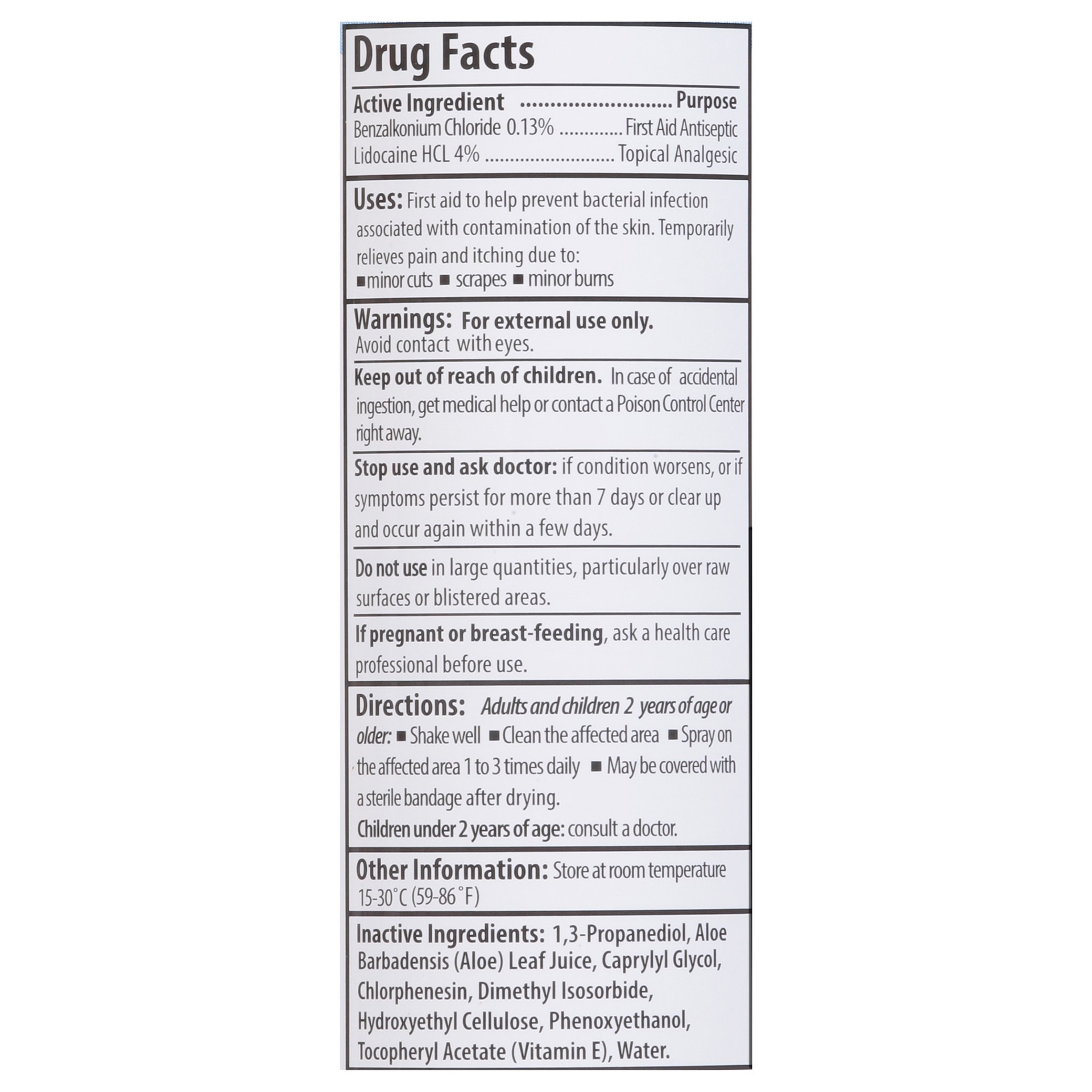 Active Ingredients: Benzalkonium Chloride (0.13 %), First Aid Antiseptic.; Lidocaine HCI (4 %), Topical Analgesic. Inactive Ingredients: 1,3-Propanediol, Aloe Barbadensis (Aloe) Leaf Juice, Caprylyl G…