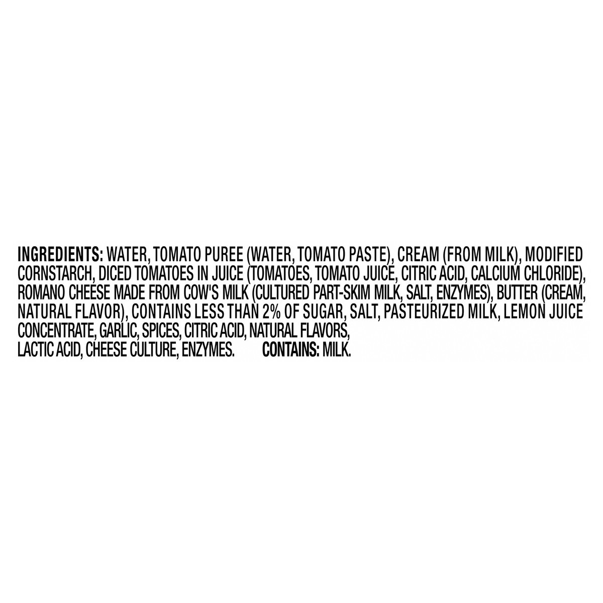WATER, TOMATO PUREE (WATER, TOMATO PASTE), CREAM (FROM MILK), MODIFIED CORNSTARCH, DICED TOMATOES IN JUICE (TOMATOES, TOMATO JUICE, CITRIC ACID, CALCIUM CHLORIDE), ROMANO CHEESE MADE FROM COW'S MILK (…