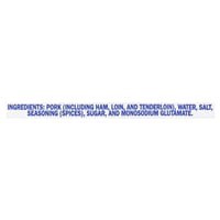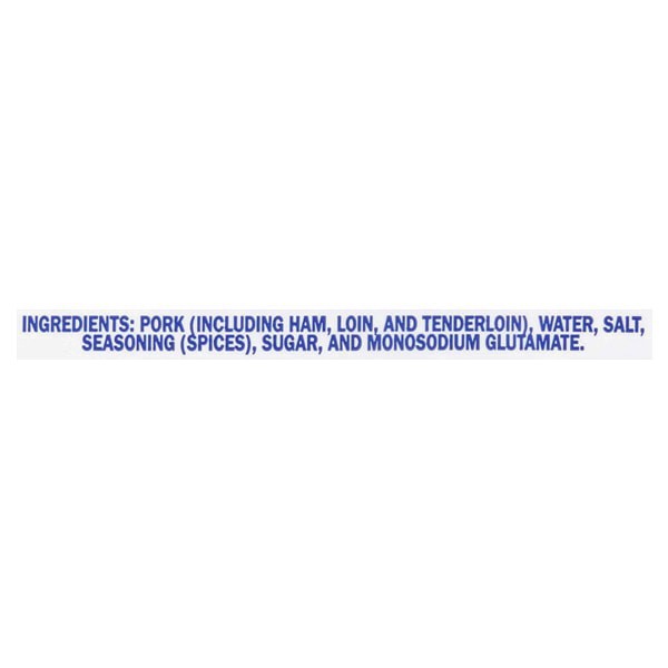 Pork (Including Ham, Lion, and Tenderloin), Water, Salt, Seasoning (Spices), Sugar, and Monosodium Glutamate.