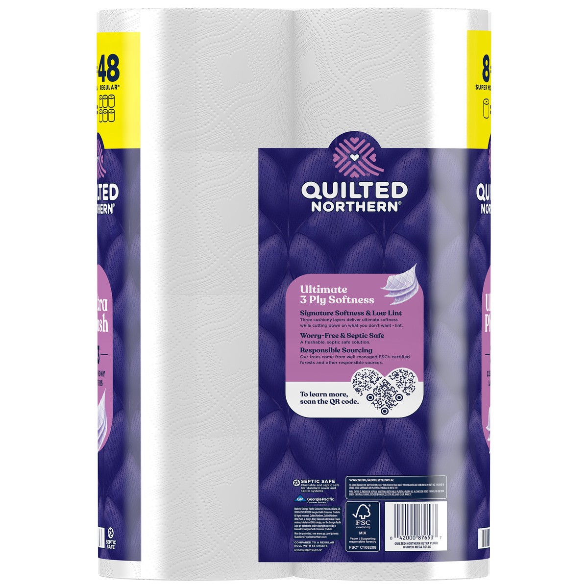 - Quilted Northern Ultra Plush Super Mega toilet tissue rolls are designed for premium performance and ultimate softness, while cutting down on what you don’t want — lint