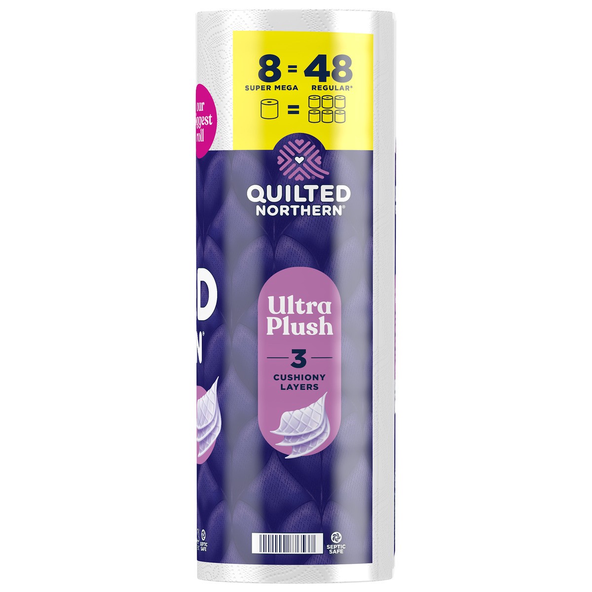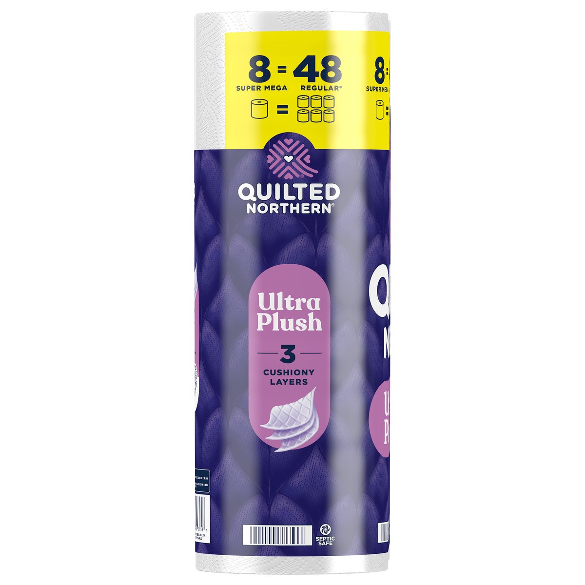 - Each toilet paper pack contains 8 Super Mega Rolls of Quilted Northern Ultra Plush bathroom tissue