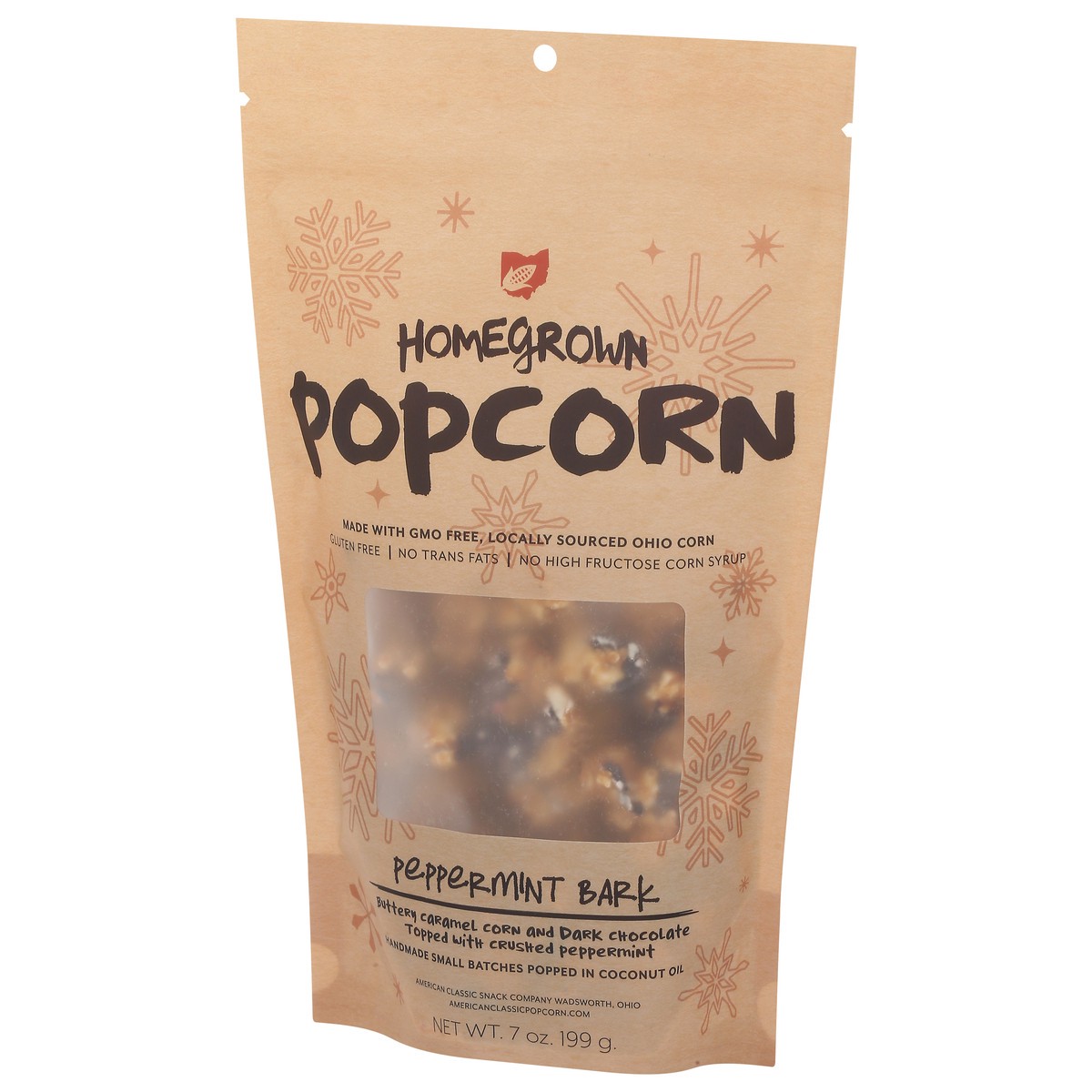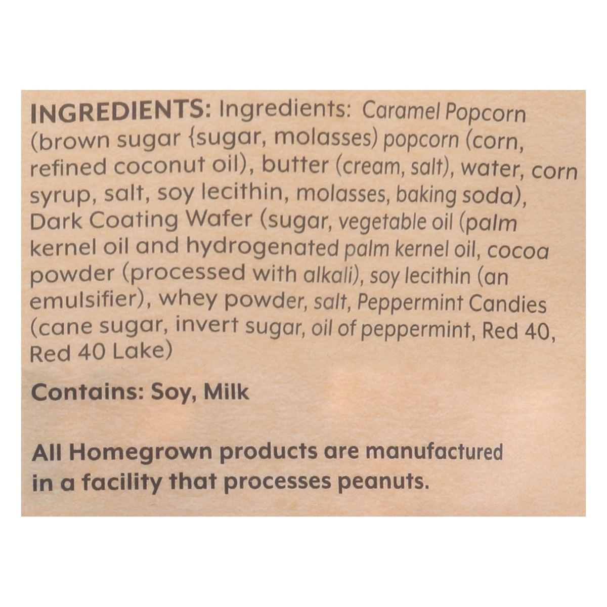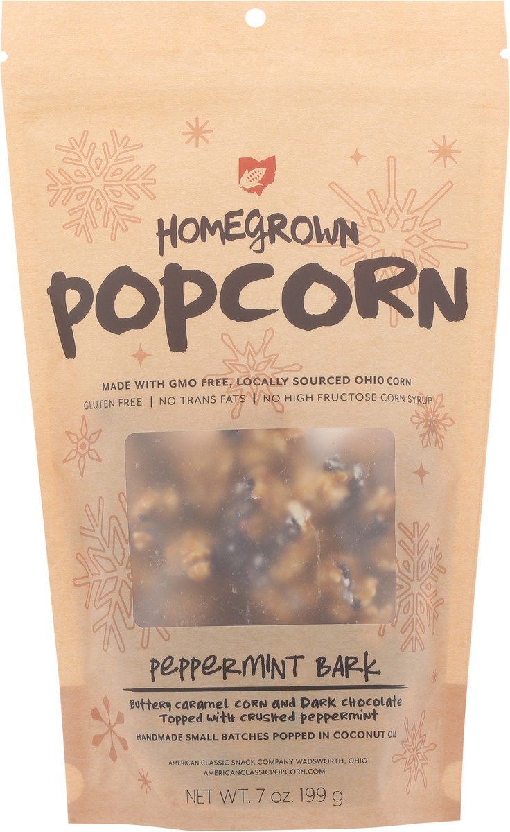 Buttery caramel corn and dark chocolate topped with crushed peppermint. Gluten free. Made with GMO free, locally sourced Ohio corn. No high fructose corn syrup. Handmade small batches popped in coconu…