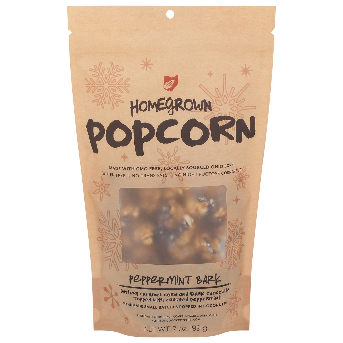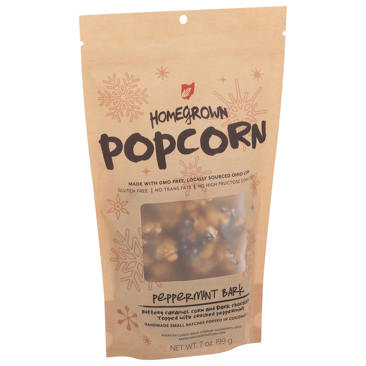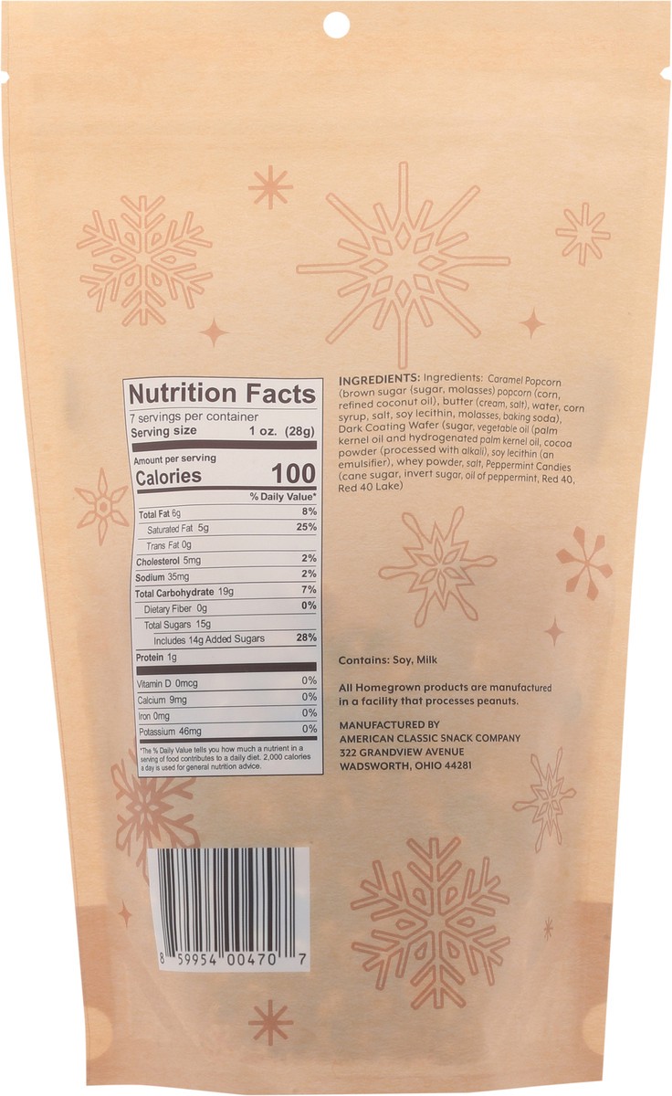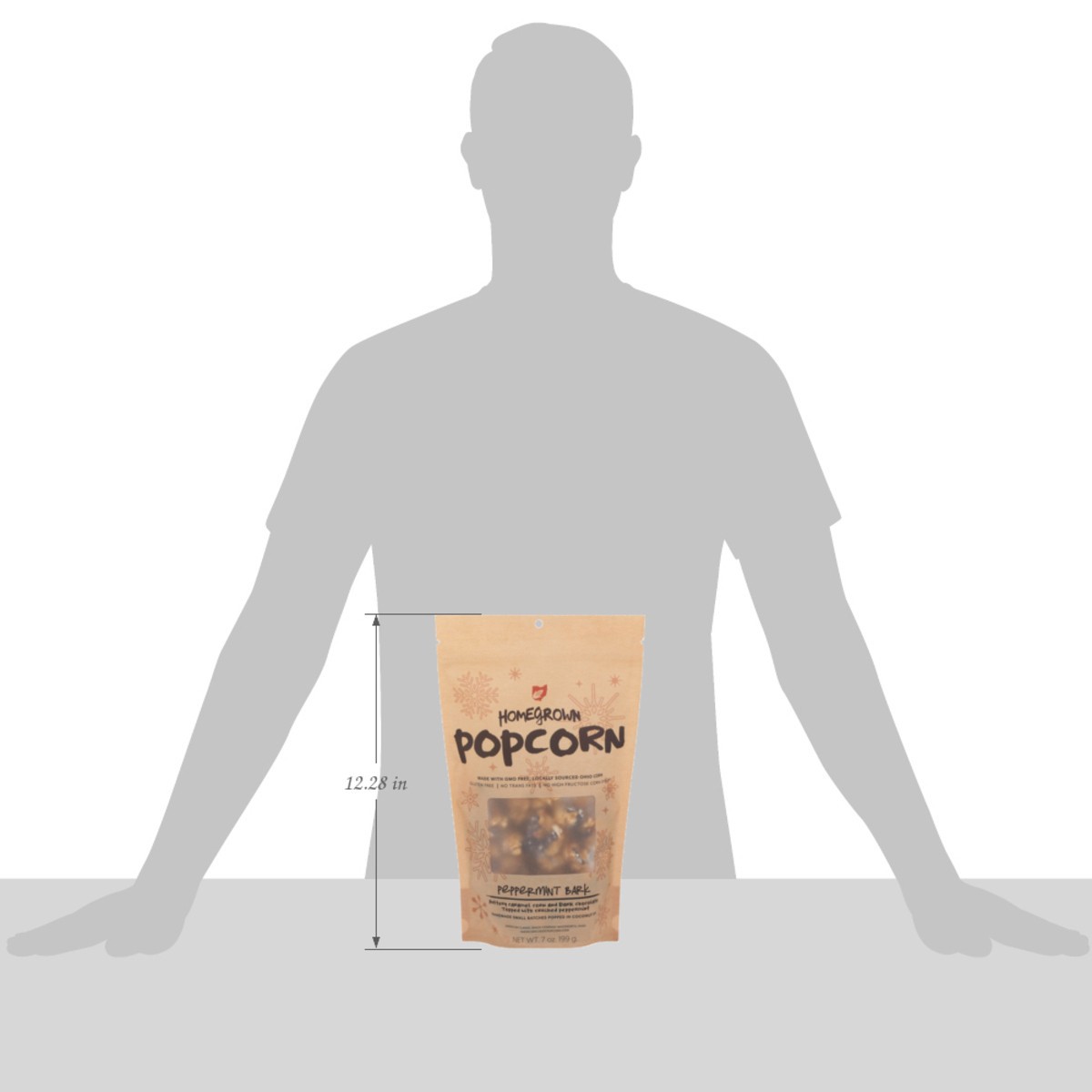 Buttery caramel corn and dark chocolate topped with crushed peppermint. Gluten free. Made with GMO free, locally sourced Ohio corn. No high fructose corn syrup. Handmade small batches popped in coconu…
