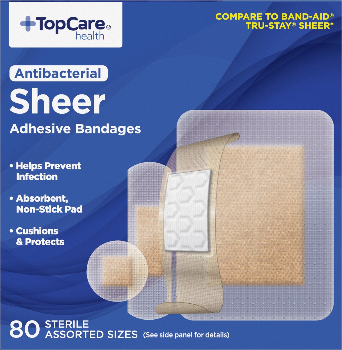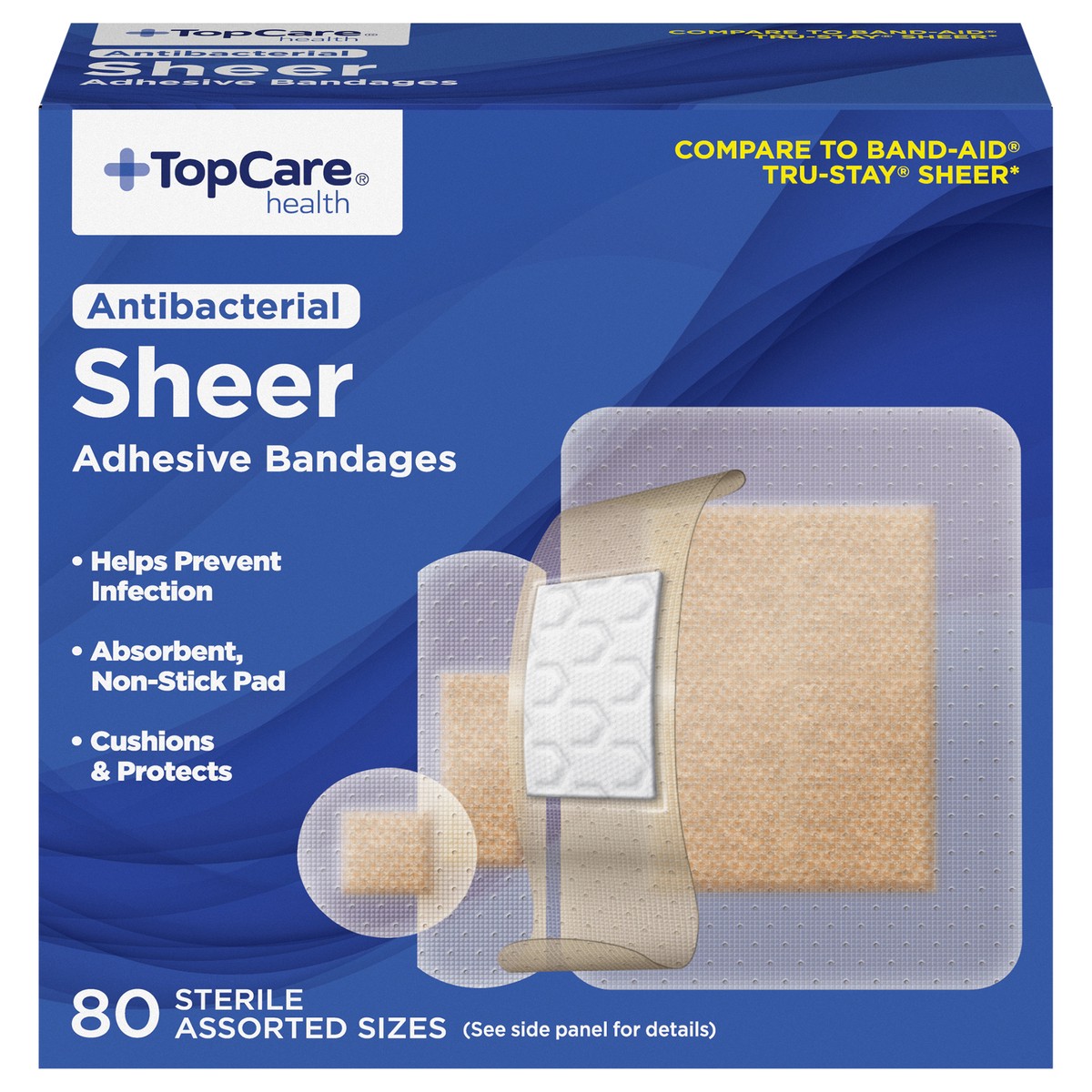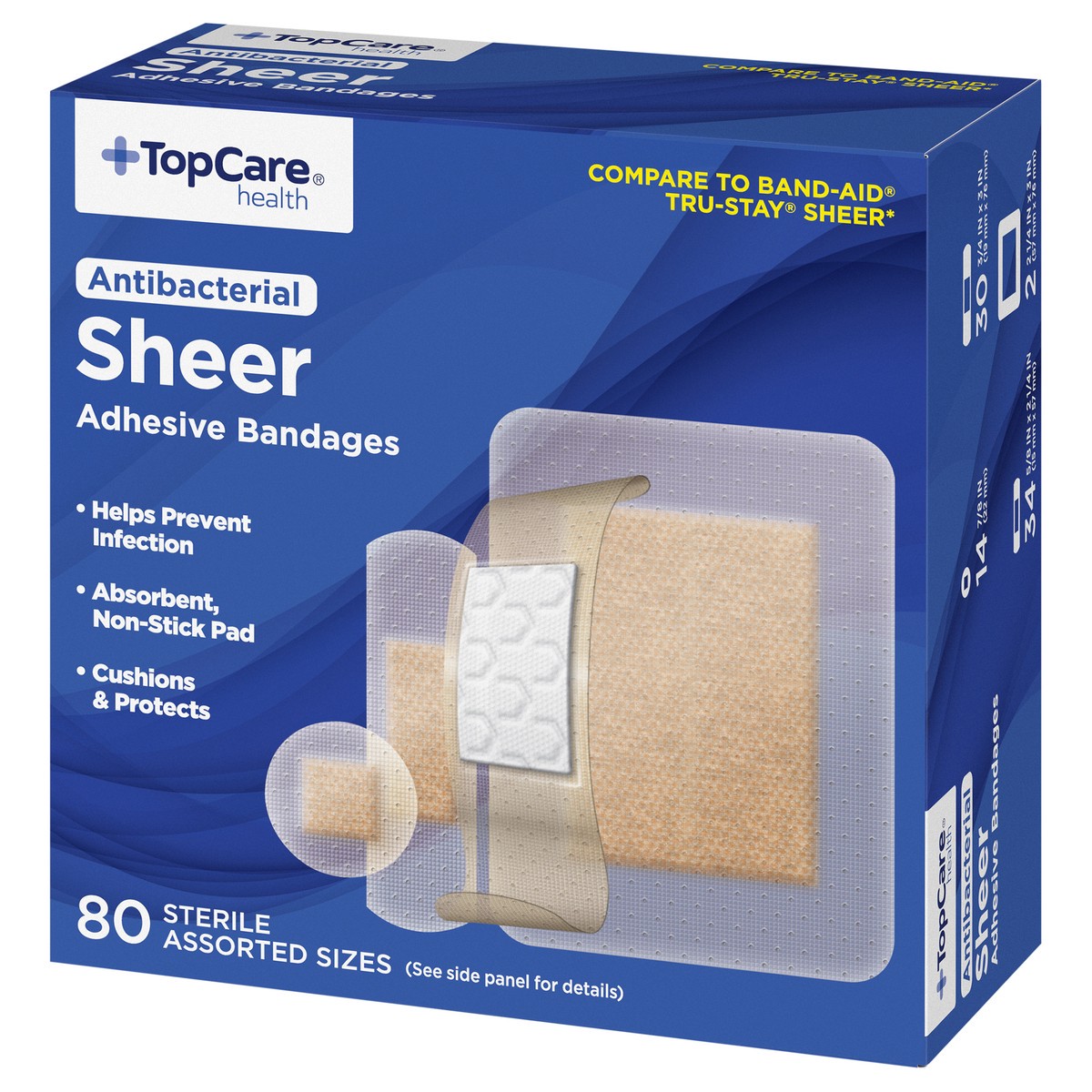TopCare Antibacterial First Aid Antiseptic Assorted Bandages, Sheer, 80 ct