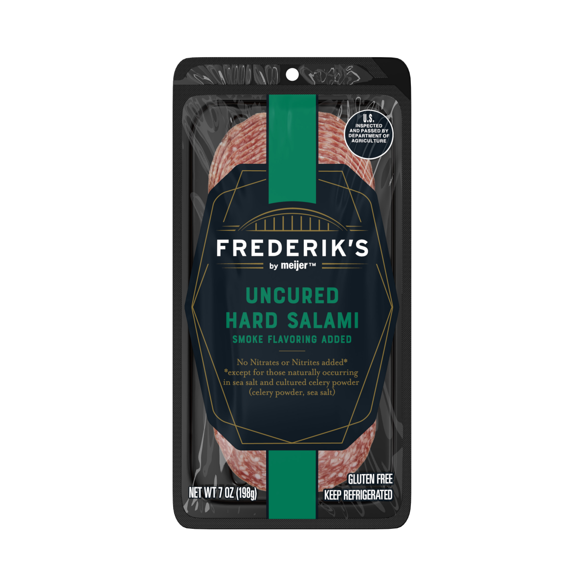 Enjoy the bold, savory taste of Frederik's by Meijer Uncured Hard Salami, perfect for sandwiches or snacks. Conveniently pre-sliced, it saves time in the kitchen, making meal prep effortless.