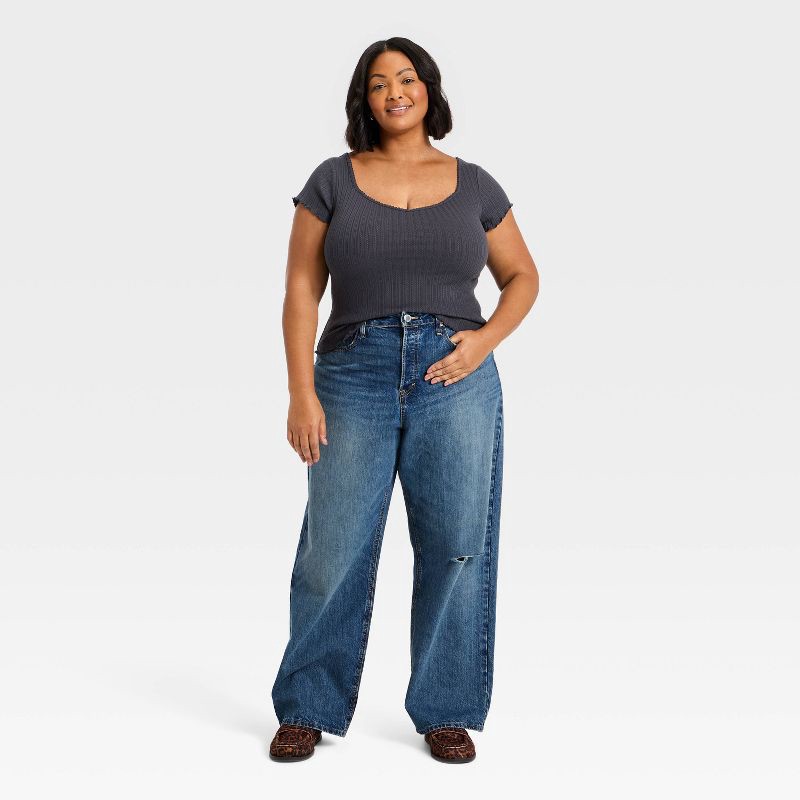 Women's Slim Fit Short Sleeve Pointelle Sweetheart Neck T-Shirt - Universal Thread™ Navy Blue XXL
