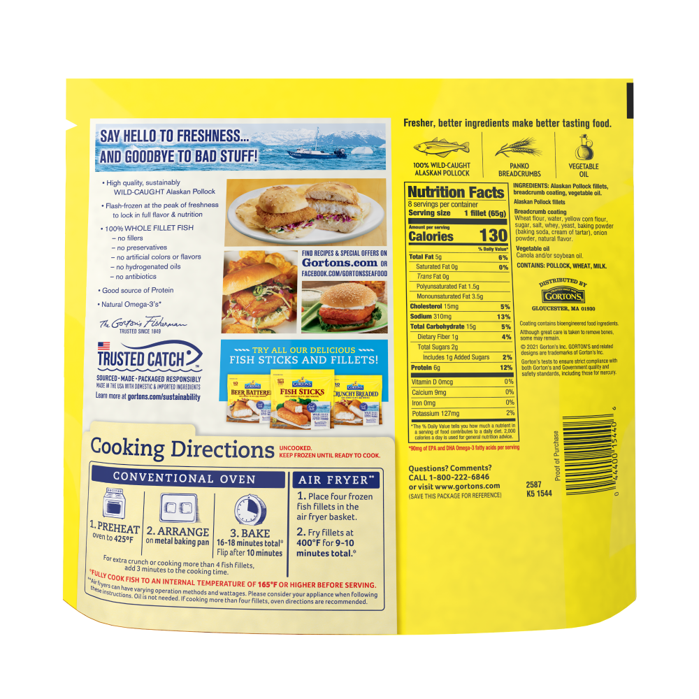 Ingedients: Pollock Fillets, Breadcrumb Coating, Canola Oil. Pollock Fillets: Pollock, Sodium Tripolyphosphate (to Retain Fish Moisture). Breadcrumb Coating: Wheat Flour, Water, Yellow Corn Flour, Sug…