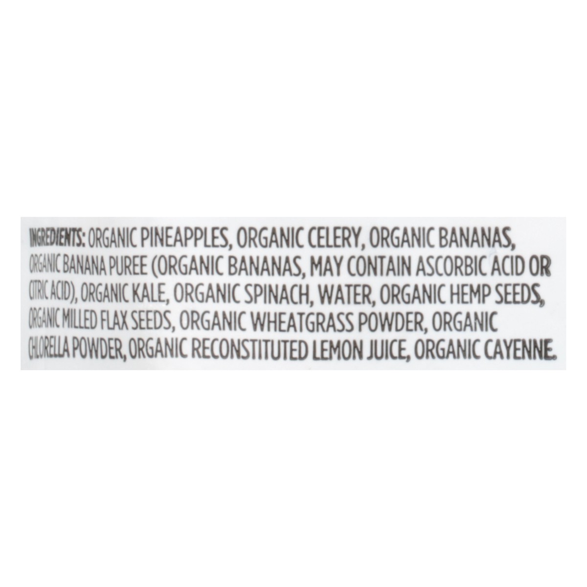 Organic Pineapples, Organic Celery, Organic Bananas, Organic Banana Puree (Organic Bananas, May Contain Ascorbic Acid or Citric Acid), Organic Kale, Organic Spinach, Water, Organic Hemp Seeds, Organic…