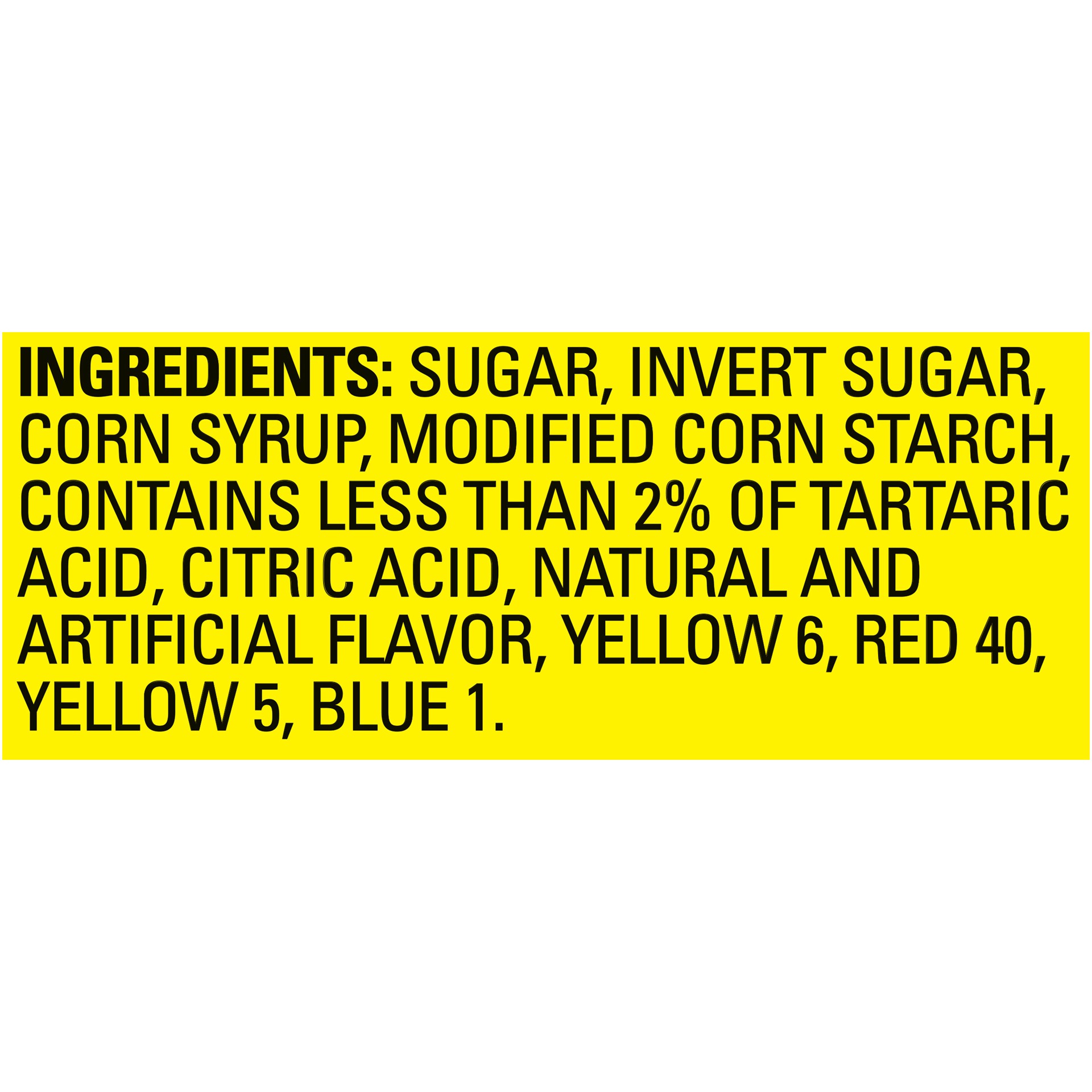 INGREDIENTS: SUGAR, INVERT SUGAR, CORN SYRUP, MODIFIED CORN STARCH, CONTAINS LESS THAN 2% OF TARTARIC ACID, CITRIC ACID, NATURAL AND ARTIFICIAL FLAVOR, YELLOW 6, RED 40, YELLOW 5, BLUE 1.