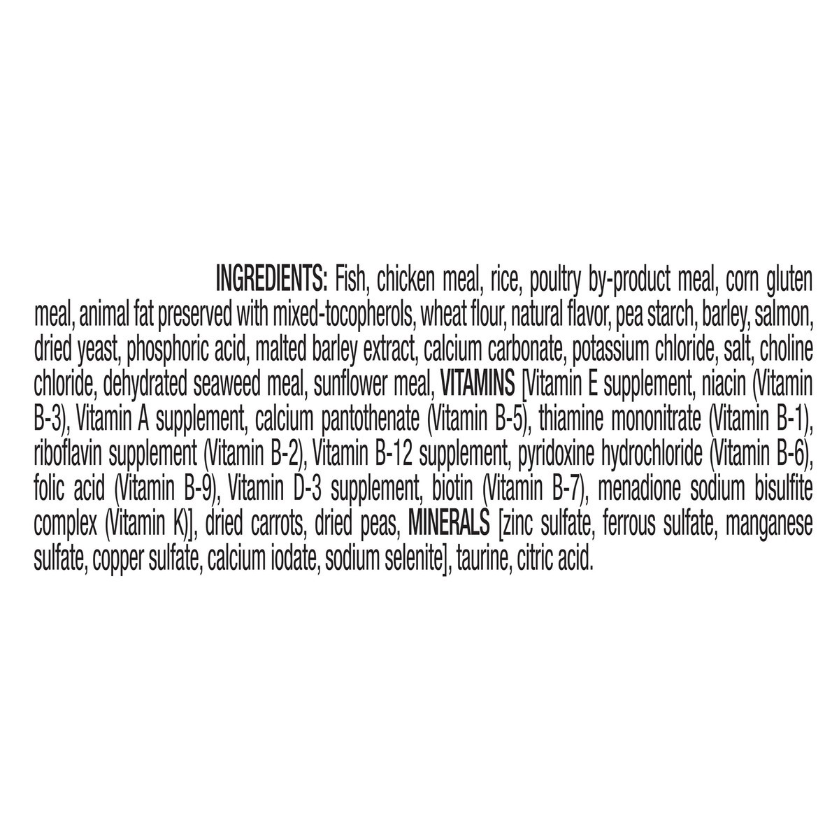 Fish, Chicken Meal, Rice, Poultry By-Product Meal , Animal Fat Preserved With Mixed-Tocopherols, Barley, Corn Gluten Meal, Wheat Flour, Pea Starch, Natural Flavors, Salmon, Dried Yeast, Phosphoric Aci…
